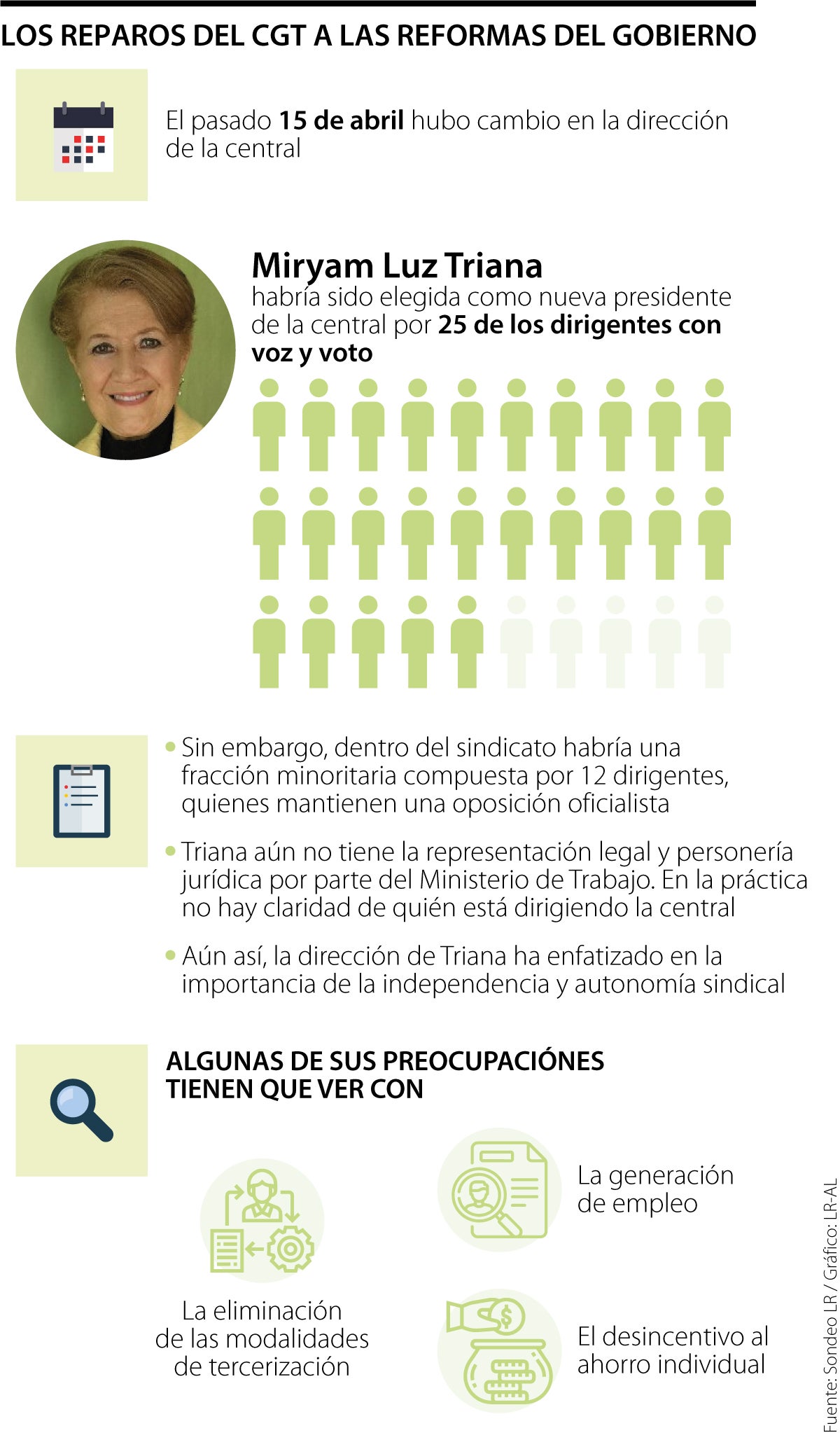 Esas personas, indirectamente, están siendo obligadas a cotizar tres años más”. Reiteró que aunque sí están de acuerdo en que se proteja a la población mayor, se debe buscar entregarles un derecho adquirido, una pensión y no un subsidio. Con el cambio de gestión que ha tenido la central, Triana y Burchardt coincidieron en que las reformas no fueron concertadas con el comité ejecutivo del sindicato, sino con un grupo minoritario adepto al Gobierno. Del 26 al 30 de julio la CGT realizará un Congreso para consolidar su autonomía sindical.