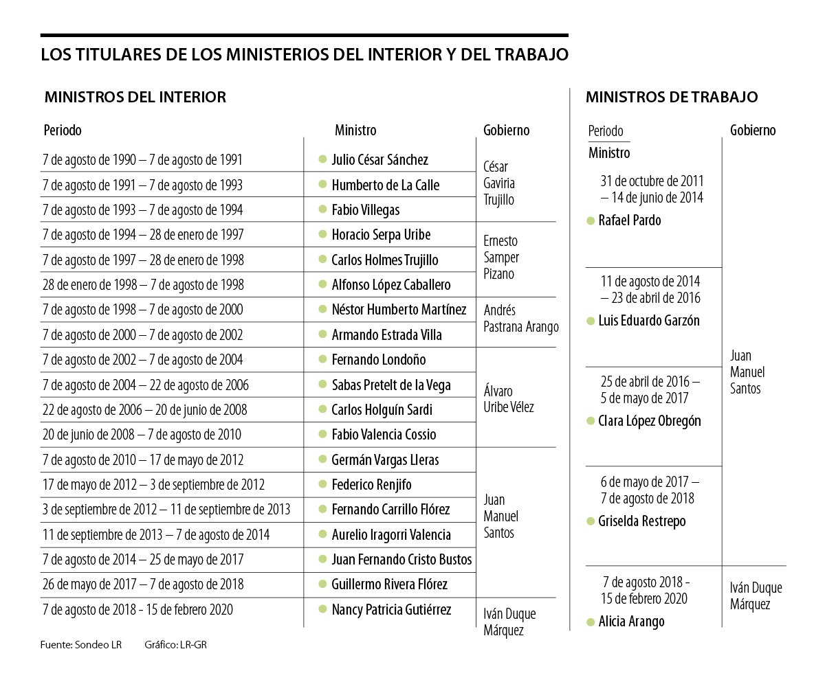 El próximo funcionario que llegue en reemplazo de Arango será, a su vez, el ministro número seis desde que se creó el Ministerio de Trabajo de manera oficial. La razón es que antes de este año esa cartera estaba fusionada con el Ministerio de Salud, pues, por ejemplo, en el gobierno de Álvaro Uribe, se le llamó Ministerio de Protección Social en el que se destacaron funcionarios como Mauricio Santamaría, Diego Palacio y Juan Luis Londoño.