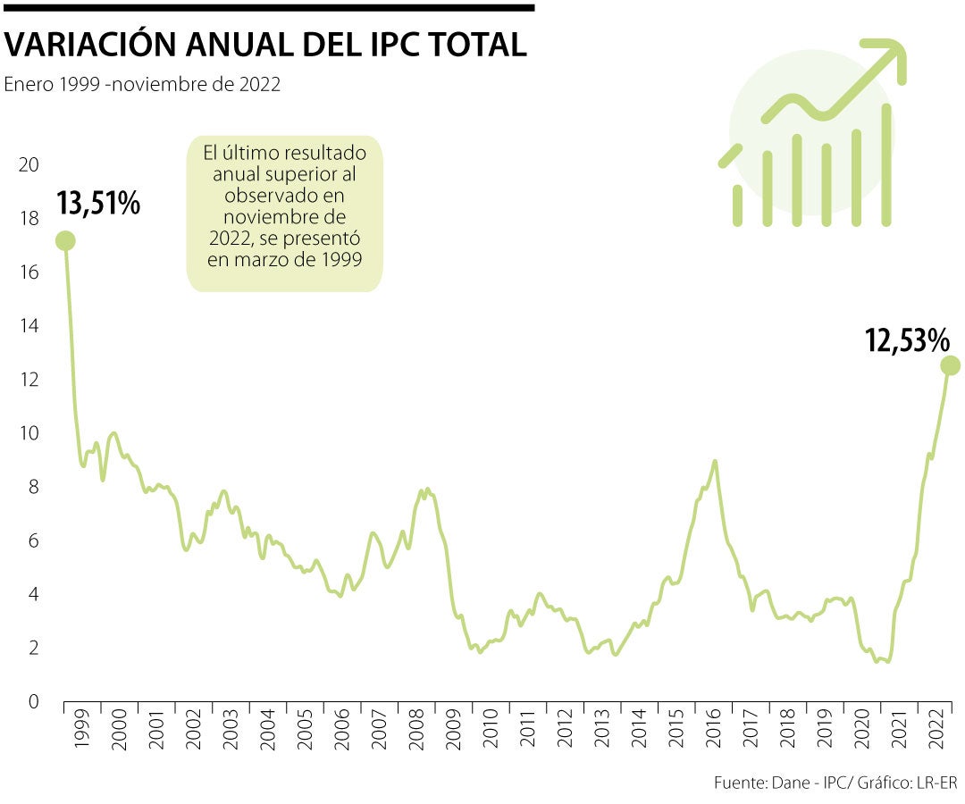 El Departamento Administrativo Nacional de Estadística (Dane) actualizó el dato de inflación de Colombia, el cual mostró que el costo de vida de los colombianos, durante el último año (diciembre 2021-diciembre 2022) se ha encarecido 13,12%, su nivel más alto desde 1999.