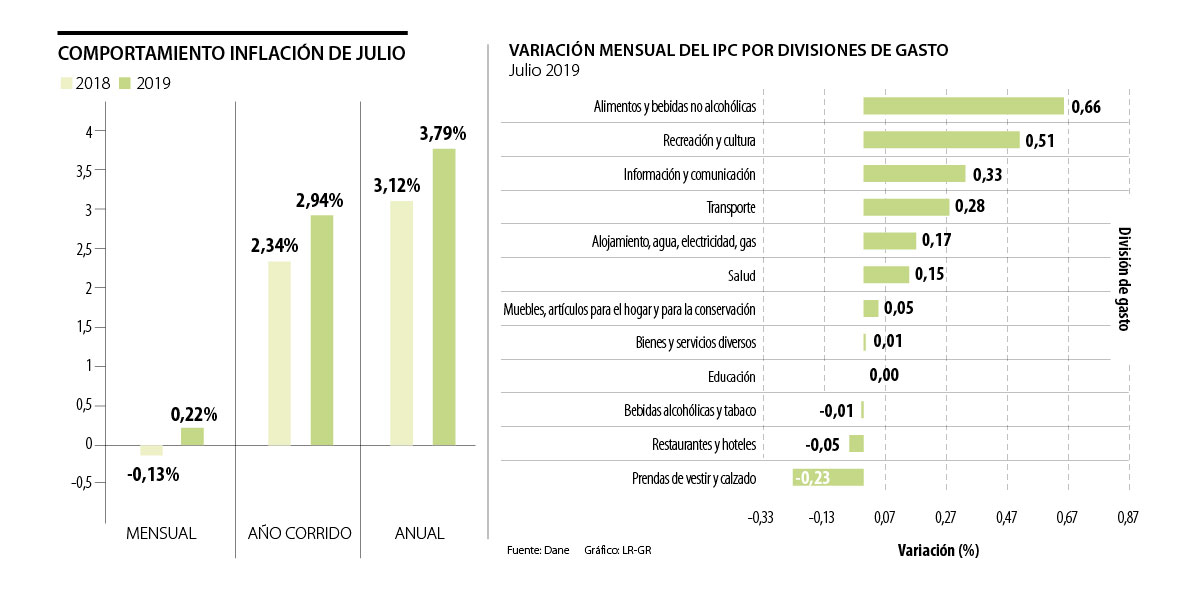 El Departamento Administrativo Nacional de Estadística (Dane) reveló ayer el resultado de la variación del Índice de Precios del Consumidor (IPC) para julio, que fue de 0,22%. Esto ubicó la variación anual en 3,79%, que no solo es el valor más alto del año, sino que está 35 puntos básicos por encima del dato del año pasado y siete puntos básicos sobre las expectativas del mercado, que ubicaban la variación anual en 3,74%.