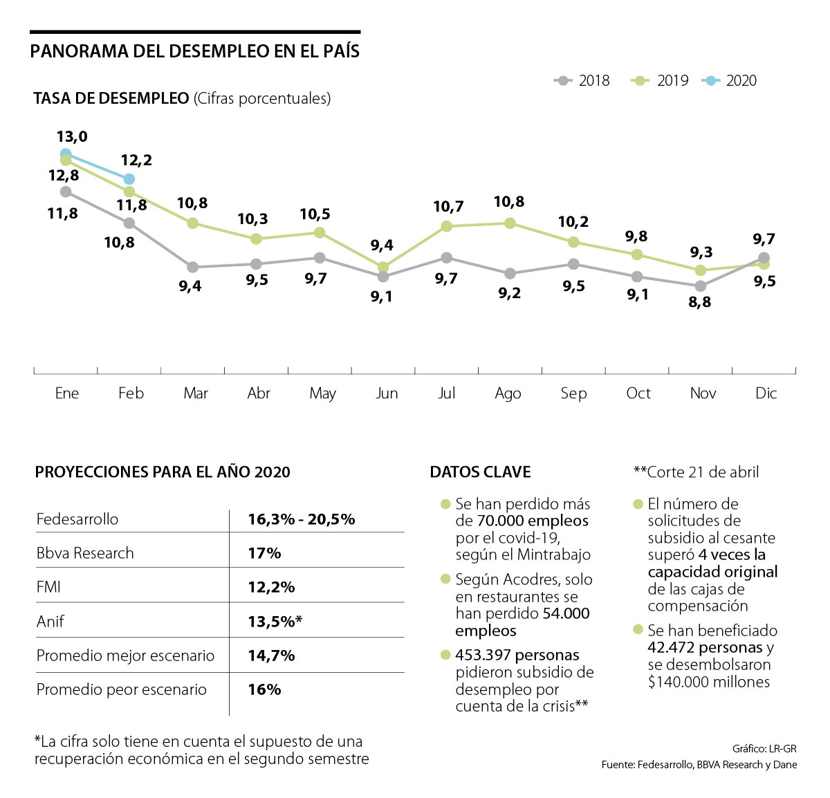 A esta conclusión llegó LR al promediar las proyecciones sobre el futuro del mercado laboral realizadas por Fedesarrollo (16,3% - 20,5%), Anif (13,5%), Bbva Research (17%) y el FMI (12,2%), por lo que se infirió que, en el mejor de los casos, el desempleo en Colombia en 2020 cerraría con una tasa del 14,7% y, en el peor de los escenarios, llegaría a 16%.