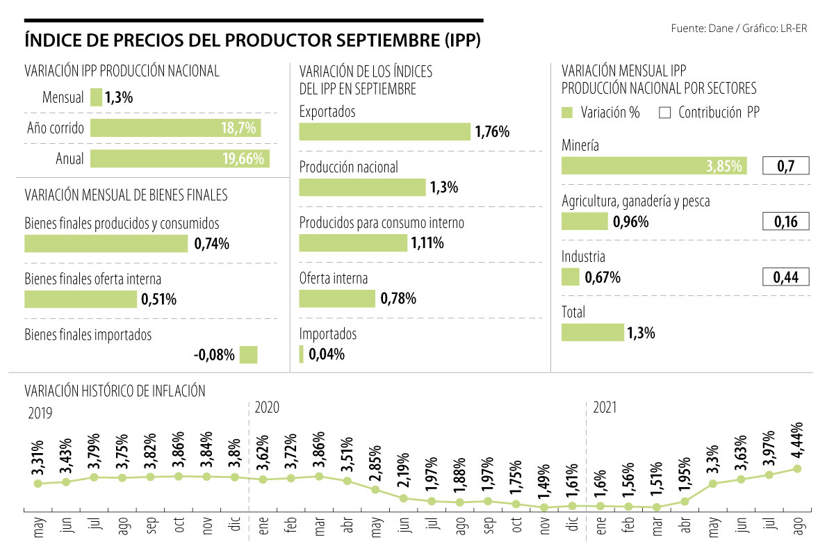Andrés Langebaek, director de estudios económicos del Grupo Bolívar, señaló que “si uno toma las agrupaciones adecuadas del IPP sin duda hay algunos productos que nos estarían mostrando que la inflación va salir relativamente al alza para septiembre y las causas se debe a que estamos en el mayor crecimiento de precios a nivel global por lo menos desde 2009, explicado en los problemas de encadenamiento, de fletes que se suman a unos costos de transporte que de por sí ya son altos”.