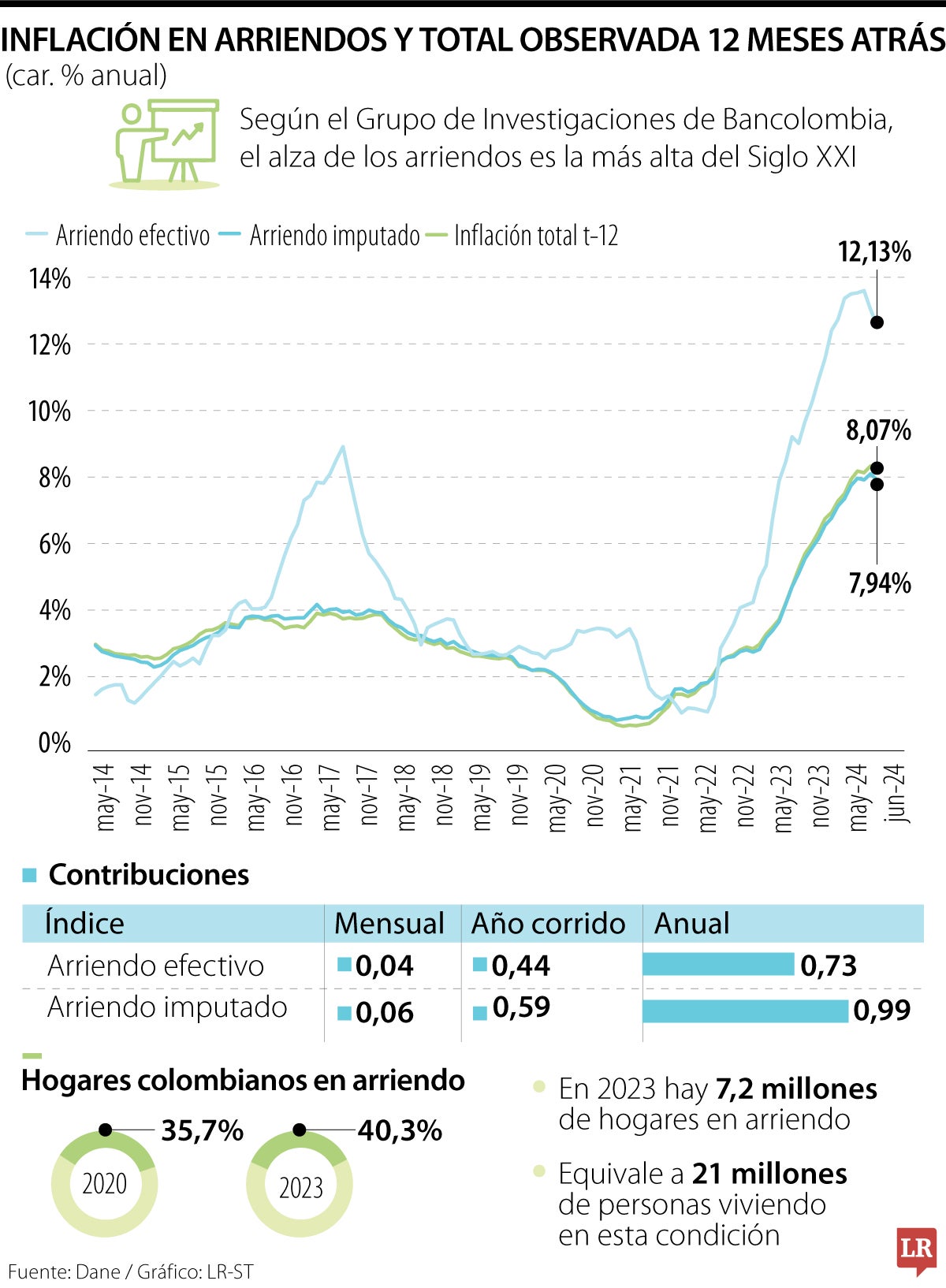 En mayo, el arriendo efectivo alcanzó 8,24% y el imputado, 8,02%, según las cuentas del Dane y, tras un análisis detallado de Bancolombia, este fue el mayor incremento del siglo XXI. Para junio, ambos componentes cayeron, con el rubro efectivo llegando a 8,07% y el imputado hasta 7,94%, con lo cual seguiría entre los más altos del presente siglo.