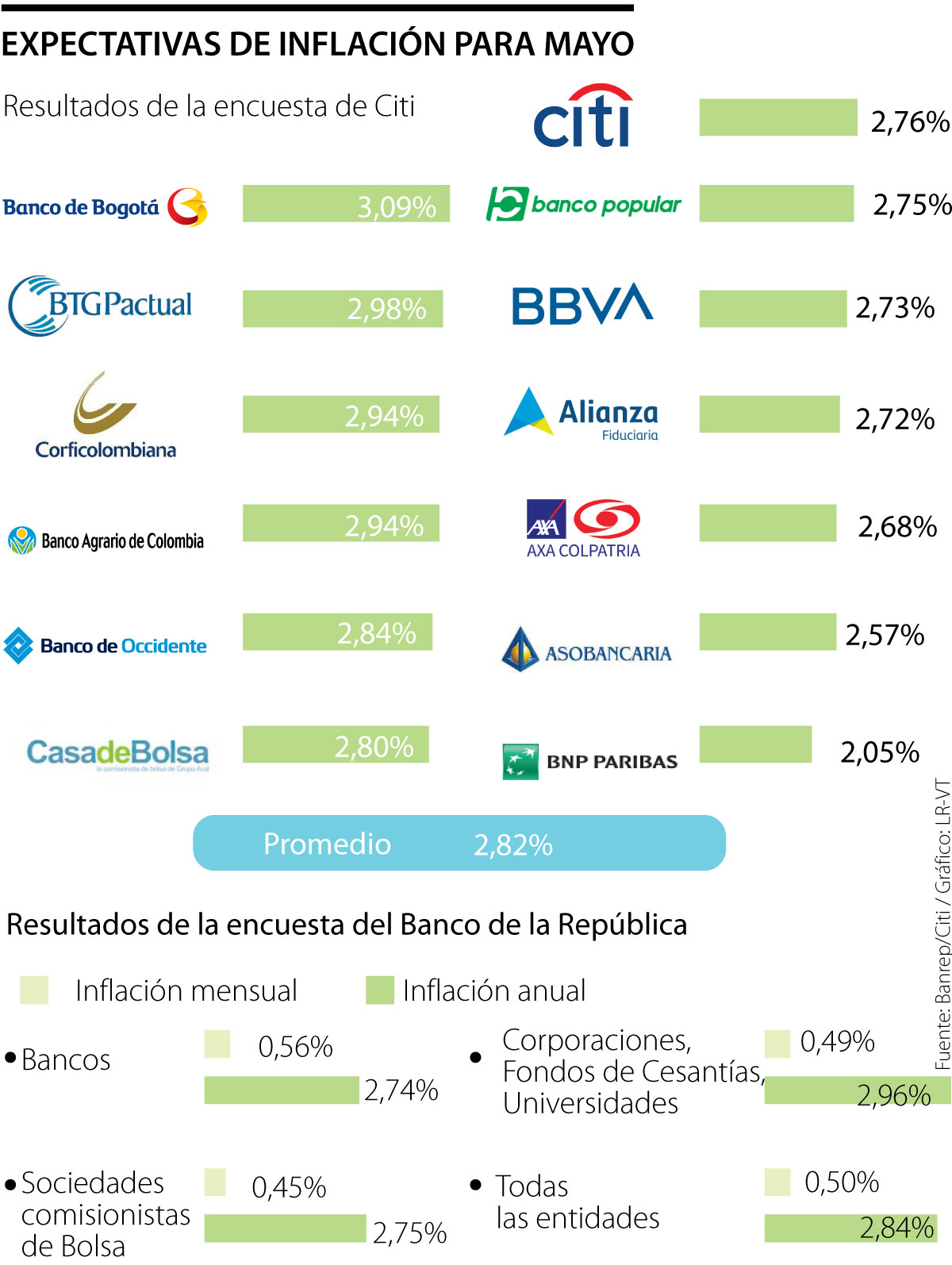 Según la encuesta de Citi, que indaga entre 25 entidades financieras, la inflación anual de mayo se apostaba en 2,82%. Así mismo, de acuerdo con la encuesta de expectativas del Banco de la República, en la que participan entidades financieras y académicas, la inflación anual del quinto mes del año se buscaba a 2,84%.