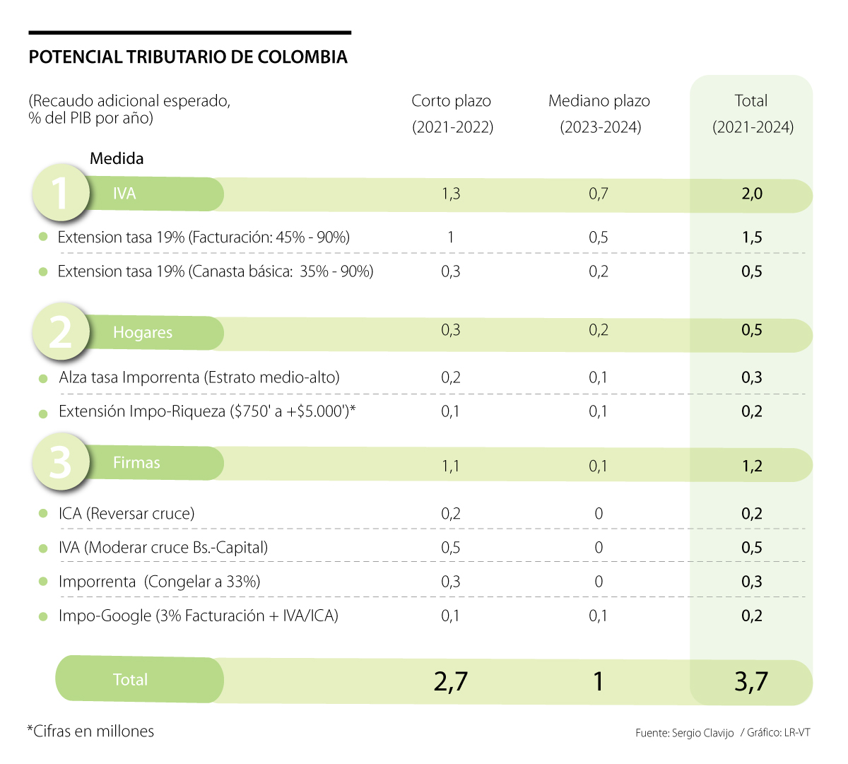 Clavijo supone que con la ampliación del IVA en facturación se llegará a un recaudo de 1% del PIB en el corto plazo (2021-2022); 0,5% del PIB en el mediano plazo (2023-2024) y 1,5% del PIB en el largo plazo (2021-2024). Lo que daría un total de recaudo estimado solo por este impuesto de 1,3% en el corto plazo, 0,7% en el mediano y 2% en el largo plazo.