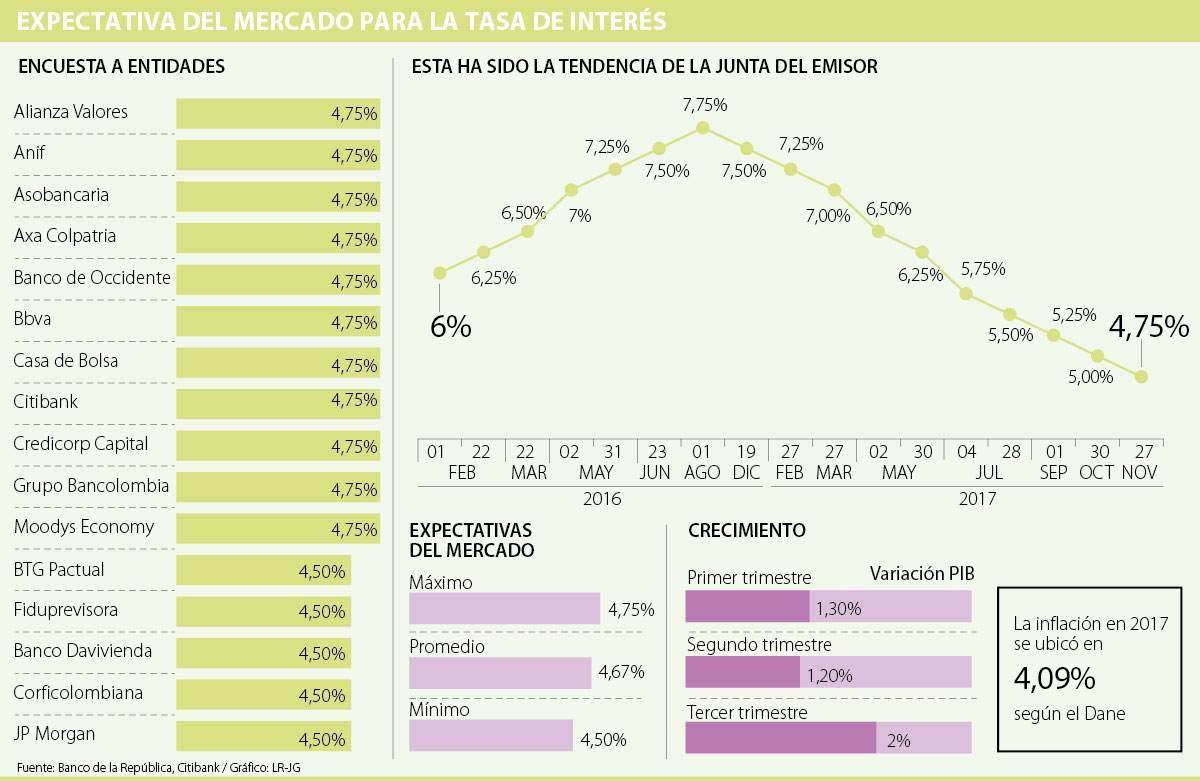 De acuerdo con la encuesta de expectativas que hizo el Citibank, la tasa de interés con la que cerrará 2018 estará entre 4% y 5%. La apuesta de 5% la hicieron JP Morgan y Moody’s Economy (aunque al ver la proyección de marzo creen que estaría en 4,25% y 4,75%, respectivamente). La de 4% la hicieron entidades como el Bbva, Adcap, Credicorp Capital y BTG Pactual. No obstante, el promedio para fin de año se ubica en 4,25%. Alianza Valores, Banco Agrario, Banco de Bogotá, Casa de Bolsa y Fiduprevisora también creen que en marzo podría llegarse a la cifra de 4,25%.