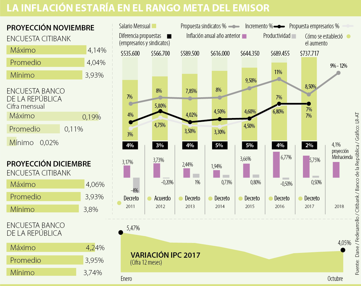 Hoy inician las discusiones alrededor del salario mínimo para 2018. Por el momento, aún falta la mayoría de las cifras que son base para empezar el debate, aunque los analistas indicaron que la inflación podría quedar en 3,9% en 2017, de acuerdo con el sondeo de Citibank y la Encuesta del Banco de la República.
