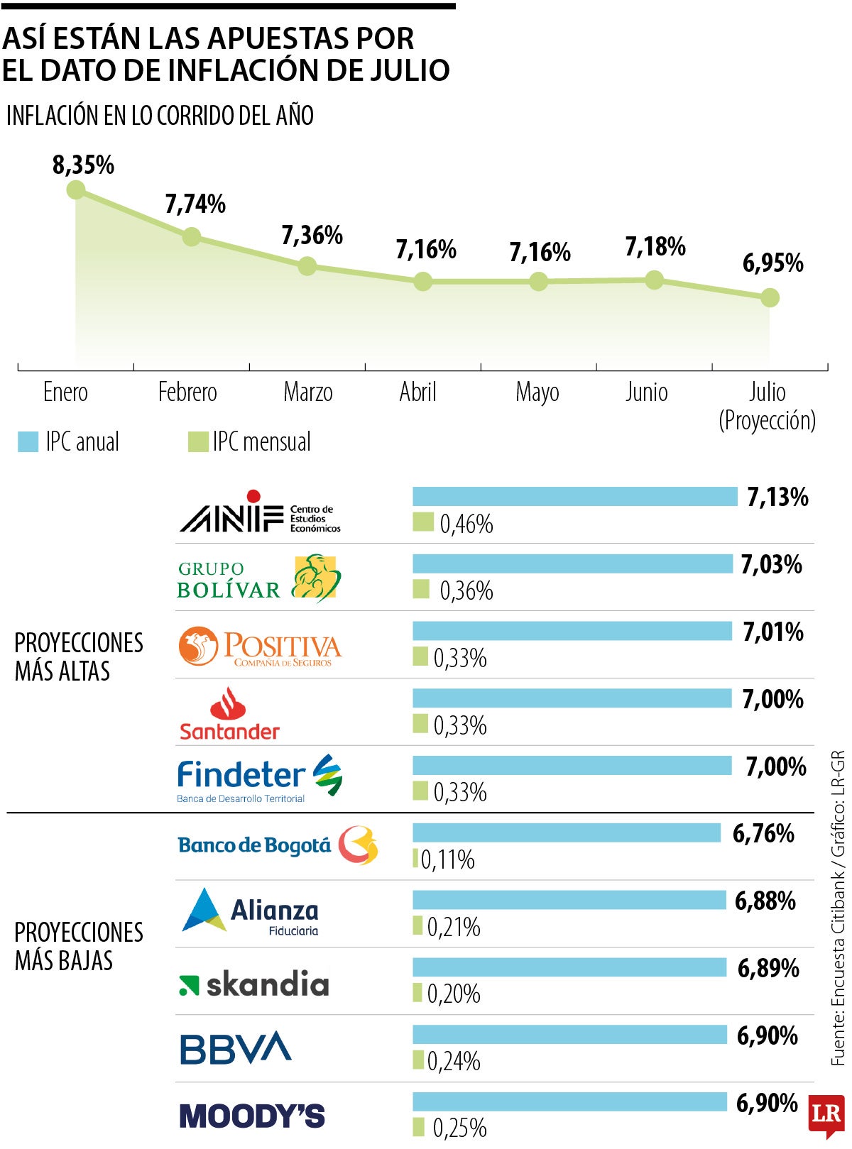 De acuerdo con una encuesta realizada por Citibank a 24 entidades y centros de investigaciones económicas del mercado financieros, se proyecta una inflación de 6,95% en julio. Las estimaciones más altas son de Anif (7,13%), Grupo Bolívar (7,03%), Positiva (7,01%), y Banco Santander y Findeter ambas con 7,00%.