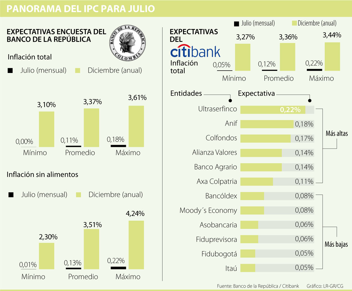 El Departamento Administrativo Nacional de Estadística (Dane) dará a conocer hoy el dato del Índice de Precios al Consumidor (IPC) del séptimo mes del año. Según la última encuesta mensual del Citibank, aquella que reúne a 28 de los actores más importantes del mercado, la inflación registraría en julio una variación promedio mensual de 0,12%, lo que arrojaría un dato anual de 3,36%, es decir, 16 puntos básicos por encima del resultado anotado en el mes anterior (3,20%).