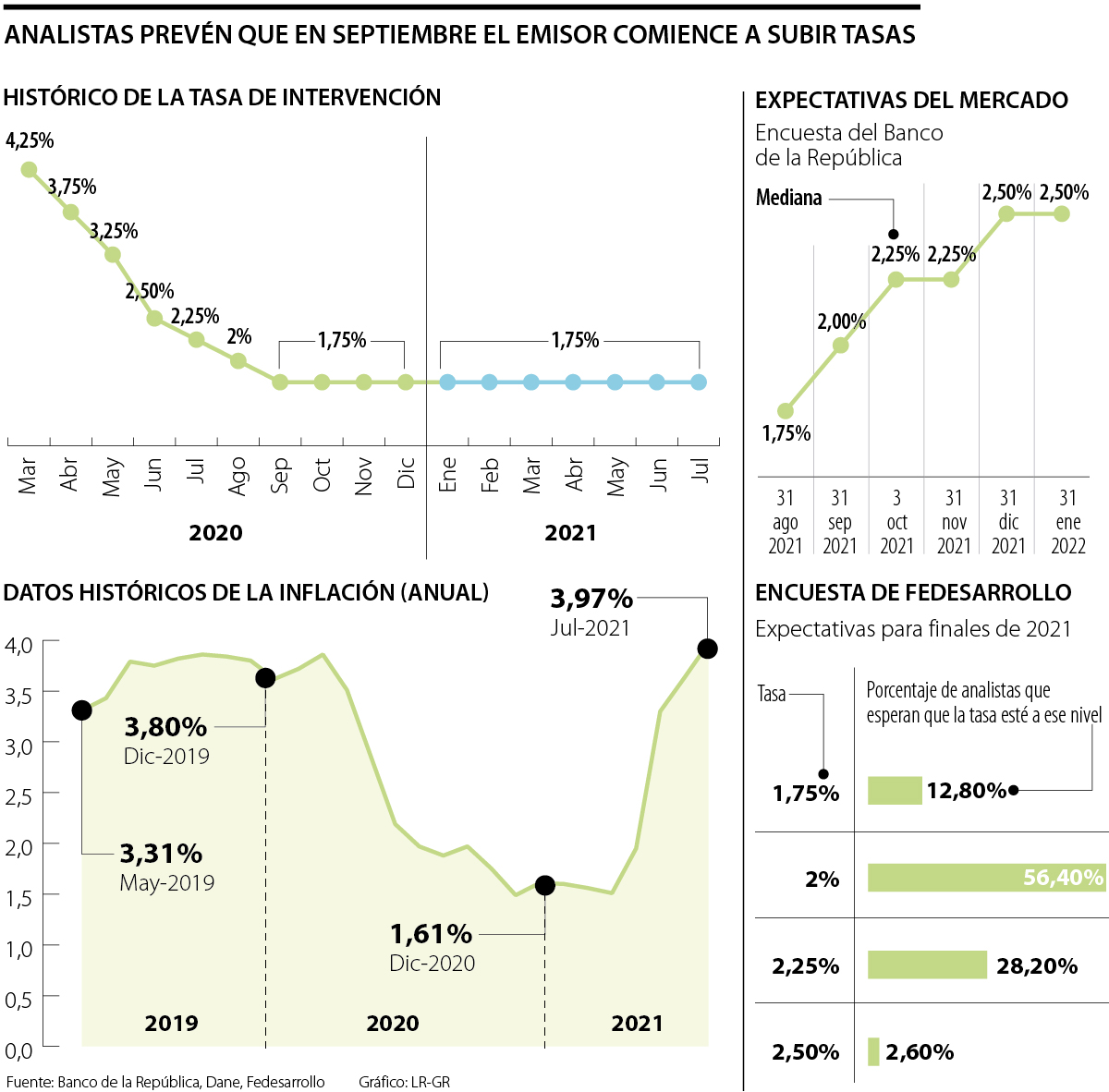 Luego de 11 meses consecutivos en los que la Junta Directiva del Banco de la República mantuvo la tasa de política monetaria en el mínimo histórico de 1,75%, los analistas, en promedio, prevén que el ciclo alcista comenzará en septiembre.