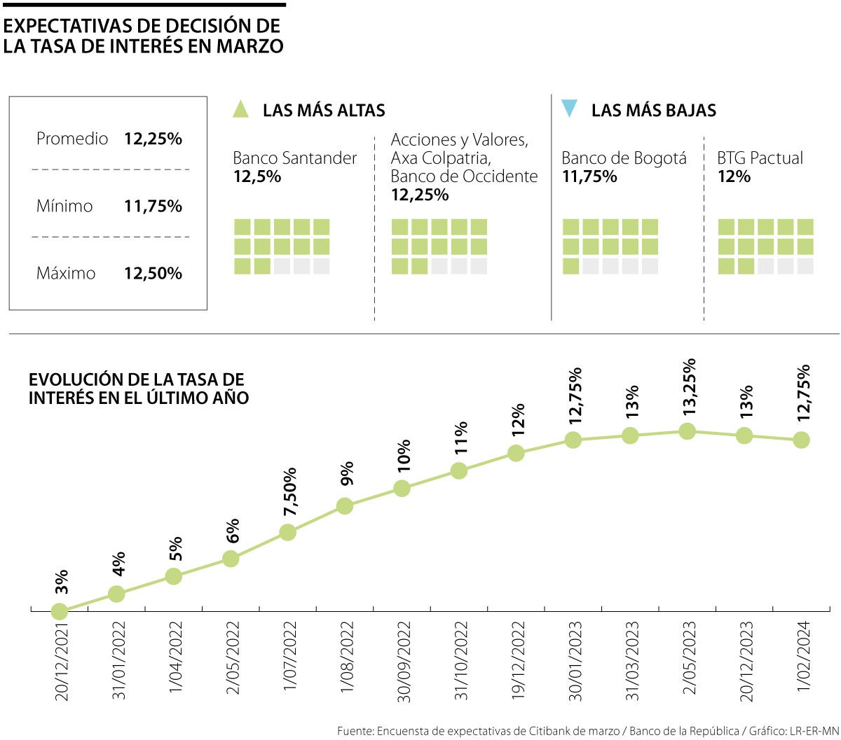 Entre las expectativas más altas están Banco de Santander, con 12,50% y otras firmas como Acciones y Valores y Banco de Occidente, con 12,25%. Mientras tanto, entre las más bajas están BTG Pactual con 12% y Banco de Bogotá con 11,75%.