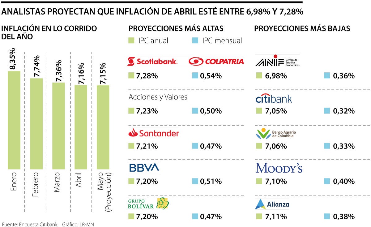 Solo un analista prevé una inflación por debajo de 7% en mayo, el centro de estudios Anif espera un IPC de 6,98%. Otras de las proyecciones más bajas son las de Citibank, con 7,05%, Banco Agrario (7,06%), Moody´s Analytics (7,10%) y Alianza (7,11%). Entre las expectativas más altas y esperan una inflación mayor a abril, están las de Scotiabank Colpatria (7,28%); Acciones y Valores (7,23%); Banco Santander (7,21%), Bbva (7,20%) y Grupo Bolívar, también empatando con 7,20%.
