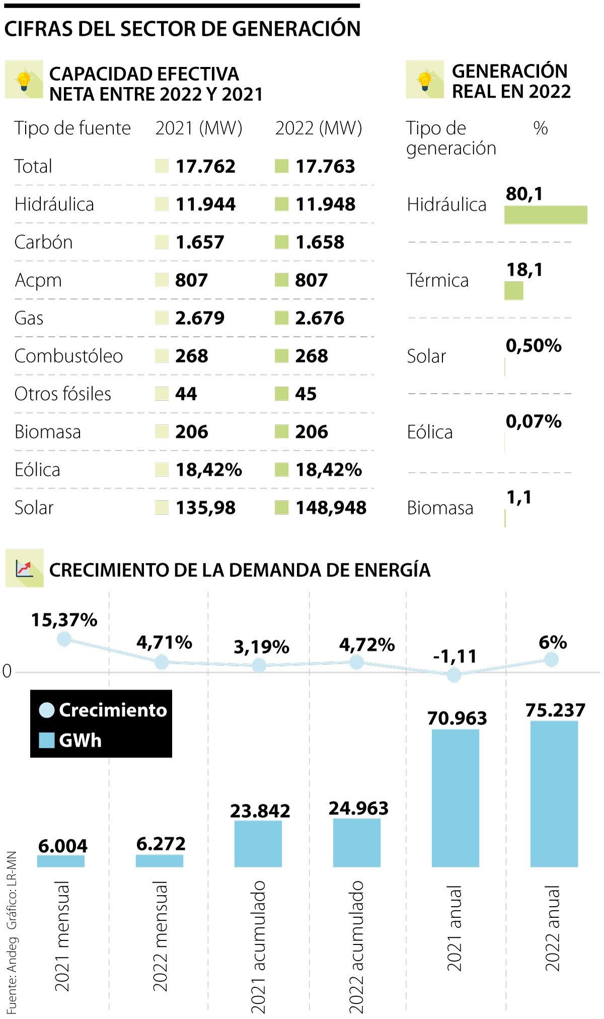 En términos de generación real, Andeg dijo que en 2022 el modelo hidráulico aporta 81,1% de la generación de energía en el país. Le sigue la energía térmica (18,1%), solar (0,5%), eólica (0,07%) y biomasa (1,1%). “Hemos tenido unos años lluviosos y la generación hidráulica ha sido predominante. En 2022, durante los primeros cuatro meses, la situación es algo parecida, pues las fuertes lluvias han generado que los embalses estén a niveles altos y tenemos un volumen importante de agua guardada. Tenemos un embalse que inició el año en 72% y se ha mantenido bien”, aseguró Castañeda.