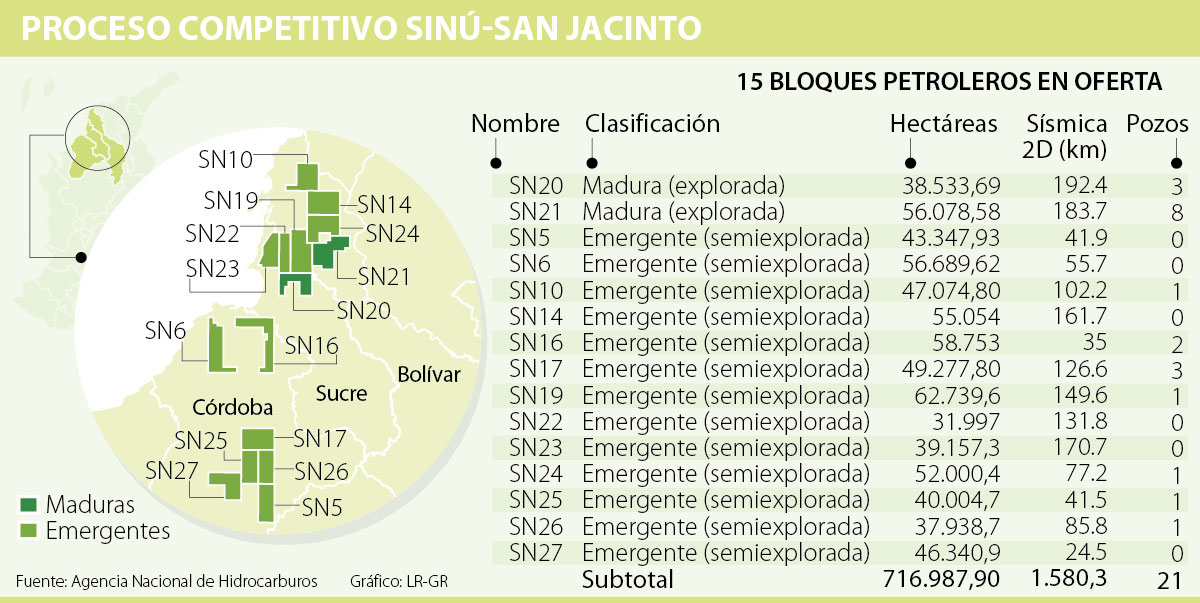 Dicho proceso incluye la oferta de 15 áreas en Sucre, Bolívar y Córdoba. Así mismo, tienen un área total de 716.988 hectáreas y hasta el momento se han perforado 21 pozos de conocimiento.