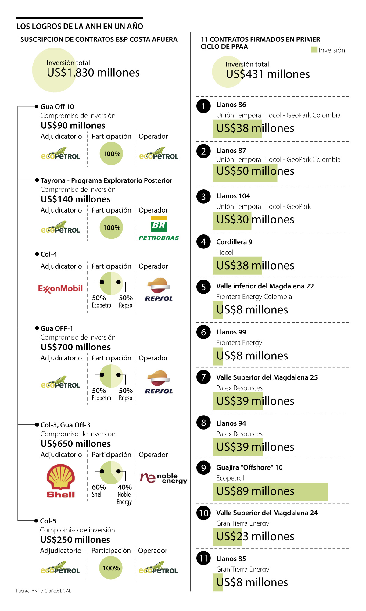 Con respecto a los contratos costa fuera, la Agencia reportó que, a la fecha, se han suscrito cinco: Ecopetrol (COL-5); Shell y Noble Energy (COL-3 Y GUA OFF-3); y con Ecopetrol, Repsol y ExxonMobil (GUA OFF-1 y COL-4). El objetivo es lograr nueve contratos con inversiones superiores a US$ 1.700 millones.