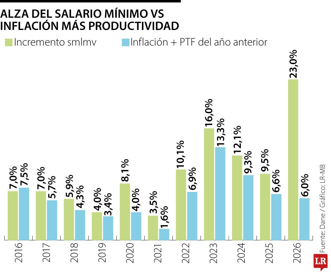 La Anif explicó que, históricamente, la diferencia entre el aumento del salario mínimo y la suma de la inflación causada con el crecimiento de la productividad ha sido de 1,3 puntos porcentuales en promedio; sin embargo, con la decisión del Gobierno de subir este sueldo en 23%, basado en el salario vital y una metodología de la Organización Internacional del Trabajo, OIT, el incremento real fue de 17,9%.