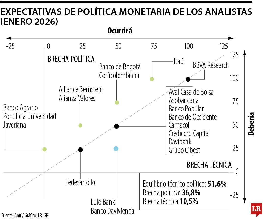 De acuerdo con el estudio, de 19 analistas consultados, ocho (Aval Casa de Bolsa, Asobancaria, Banco Popular, Banco de Occidente, Camacol, Credicorp Capital, Davibank y Grupo Cibest) coincidieron en que el Emisor debería aumentar la tasa en 50 puntos básicos y afirmaron que teniendo en cuenta la inflación con la que cerró 2025 (5,15%) y el aumento del salario mínimo, esta alza coincidirá con la decisión final.
