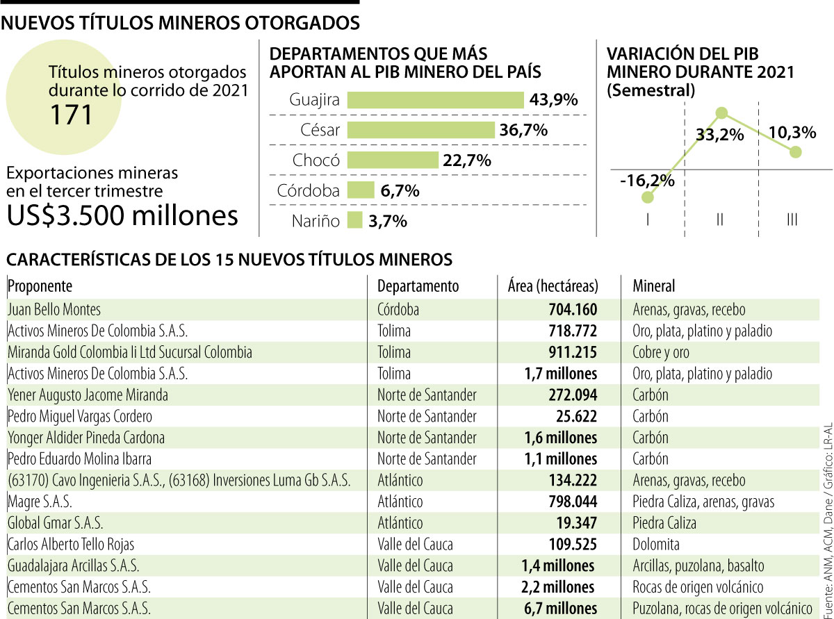 De los títulos otorgados, ocho están en la escala de mediana minería y siete en la pequeña. Los permisos en esta última ronda se dieron para la exploración de carbón, cobre, oro, plata, platino, arcilla, arena y materiales de construcción, en los municipios de Tierra Alta, Valencia, en el departamento de Córdoba; Falan en Tolima; El Zulia en Norte de Santander; Barranquilla y Puerto Colombia en Atlántico; y Yumbo y Cartago en el Valle del Cauca.