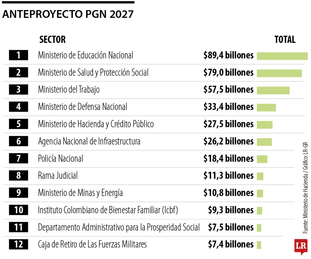 El listado de los 10 con mayor asignación de recursos lo completarían la Agencia Nacional de Infraestructura, con $26,2 billones; la Policía Nacional, con $18,4 billones; la Rama Judicial, con $11,3 billones; el Ministerio de Minas y Energía, con $10,8 billones; y el Instituto Colombiano de Bienestar Familiar, con $9,3 billones.