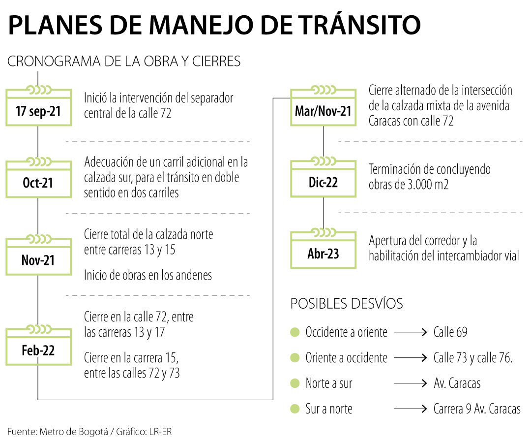 La empresa Metro de Bogotá, junto con la Secretaría de Movilidad, y Metro Línea 1 presentaron el Plan de manejo de tránsito (PMT), las etapas de construcción y el cronograma de desvíos que tendrá la calle 72 con Av. Caracas para ejecutar las obras del intercambiador vial que ya comenzaron.