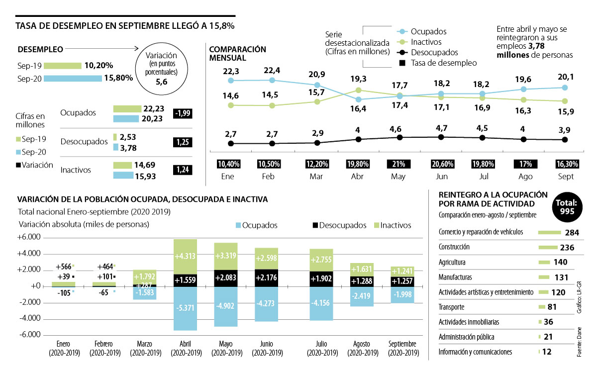 Según el Dane, la tasa de desempleo en septiembre fue de 15,8%, la más baja desde marzo, y a este mes se recuperaron 67% de los puestos, ya que en abril se perdieron 5,4 millones y al noveno mes la cifra de reempleo llegó a 3,7 millones de ese total.