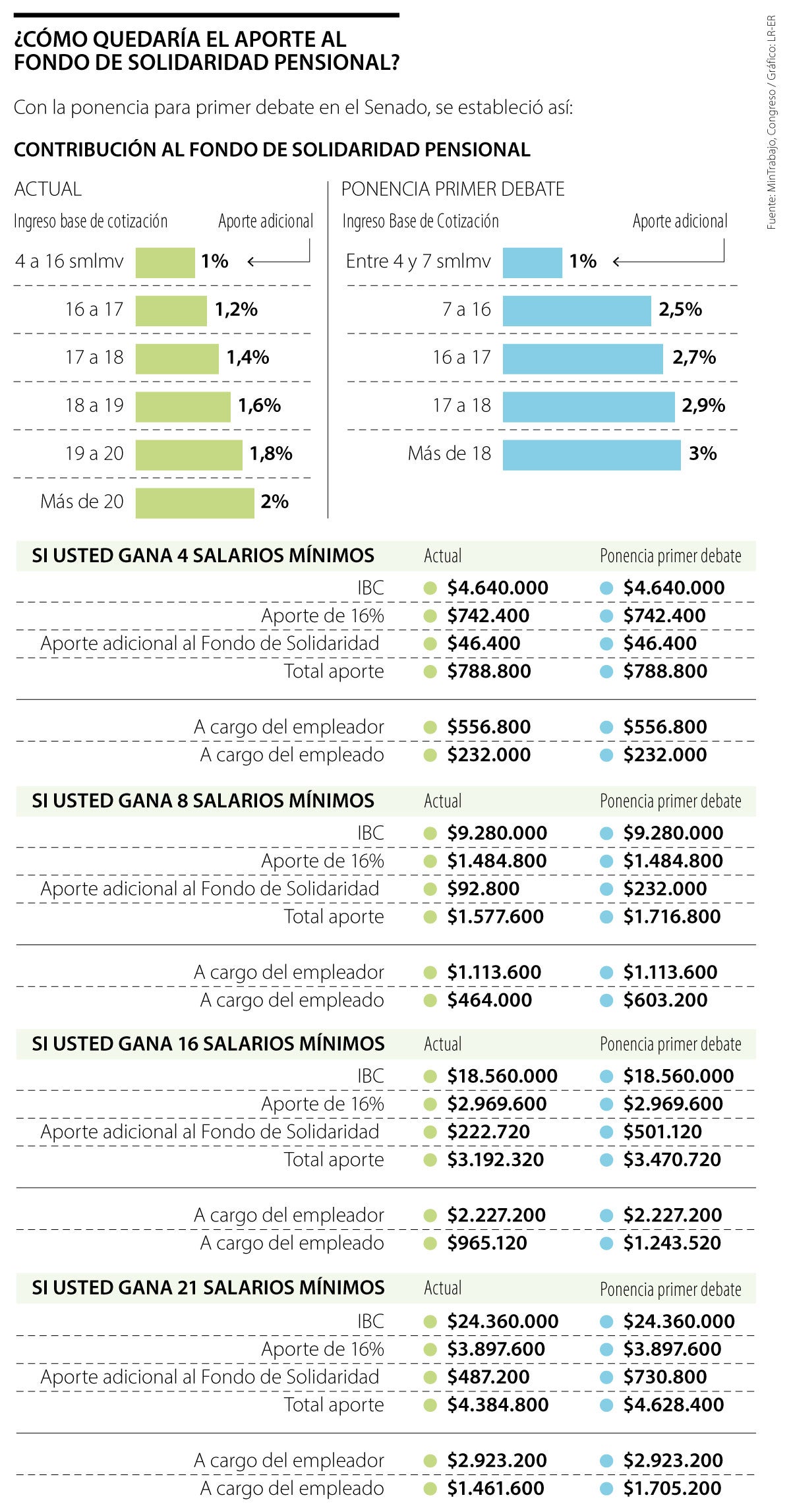 Explicado en cifras sería algo así: si usted gana 21 salarios mínimos, tendrá que aportar 3% de su IBC al Fondo de Solidaridad Pensional, es decir, unos $730.800; mientras que en el sistema actual su aporte es de 2%, unos $487.200. Entonces, con la reforma tendría que aportar $243.600 más que hoy.