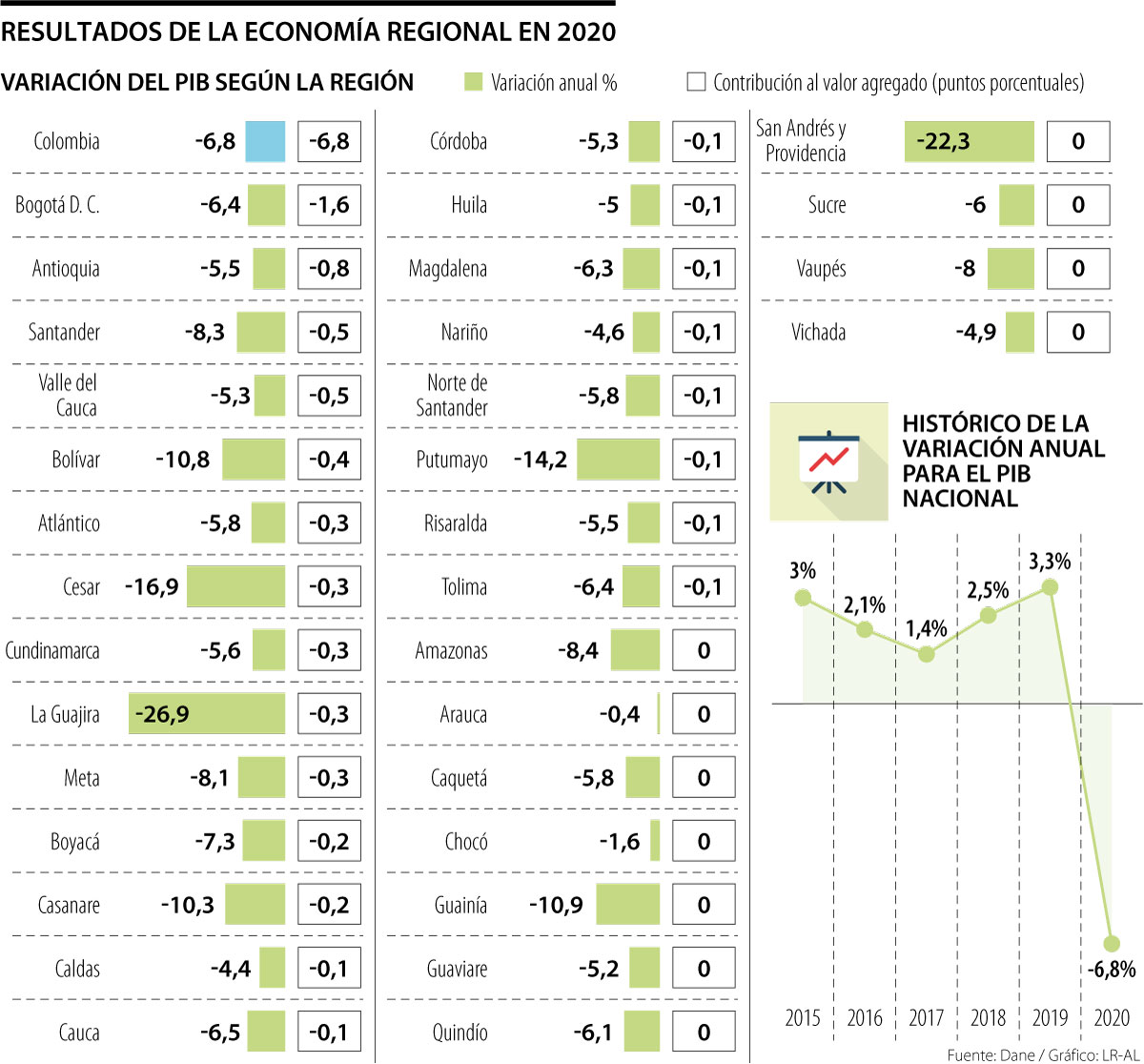 Luego de que se reportara una caída histórica de 6,8% en el Producto Interno Bruto (PIB) colombiano en 2020, el Departamento Administrativo Nacional de Estadística (Dane) entregó los resultados del PIB departamental al cierre del año pasado, unas cifras que dejan ver la contracción de la actividad económica en las regiones tras la llegada del covid-19.