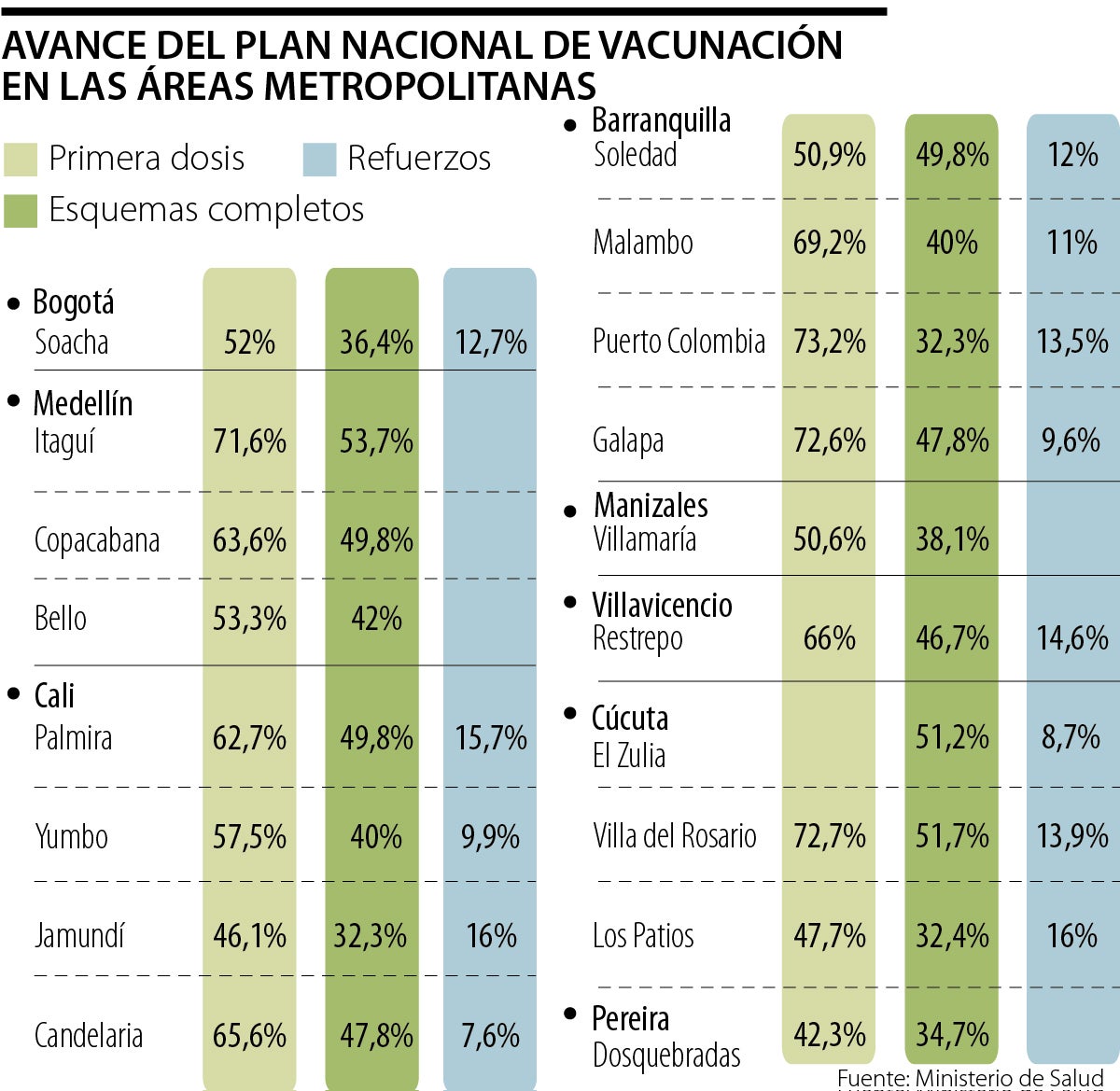 Mientras la mayoría de ciudades capitales ya ha superado 60% de su población vacunada, ningún municipio del área metropolitana de las ciudades principales lo ha conseguido; las que más se acercan son Itaguí en Antioquia y Villa del Rosario en Norte de Santander.
