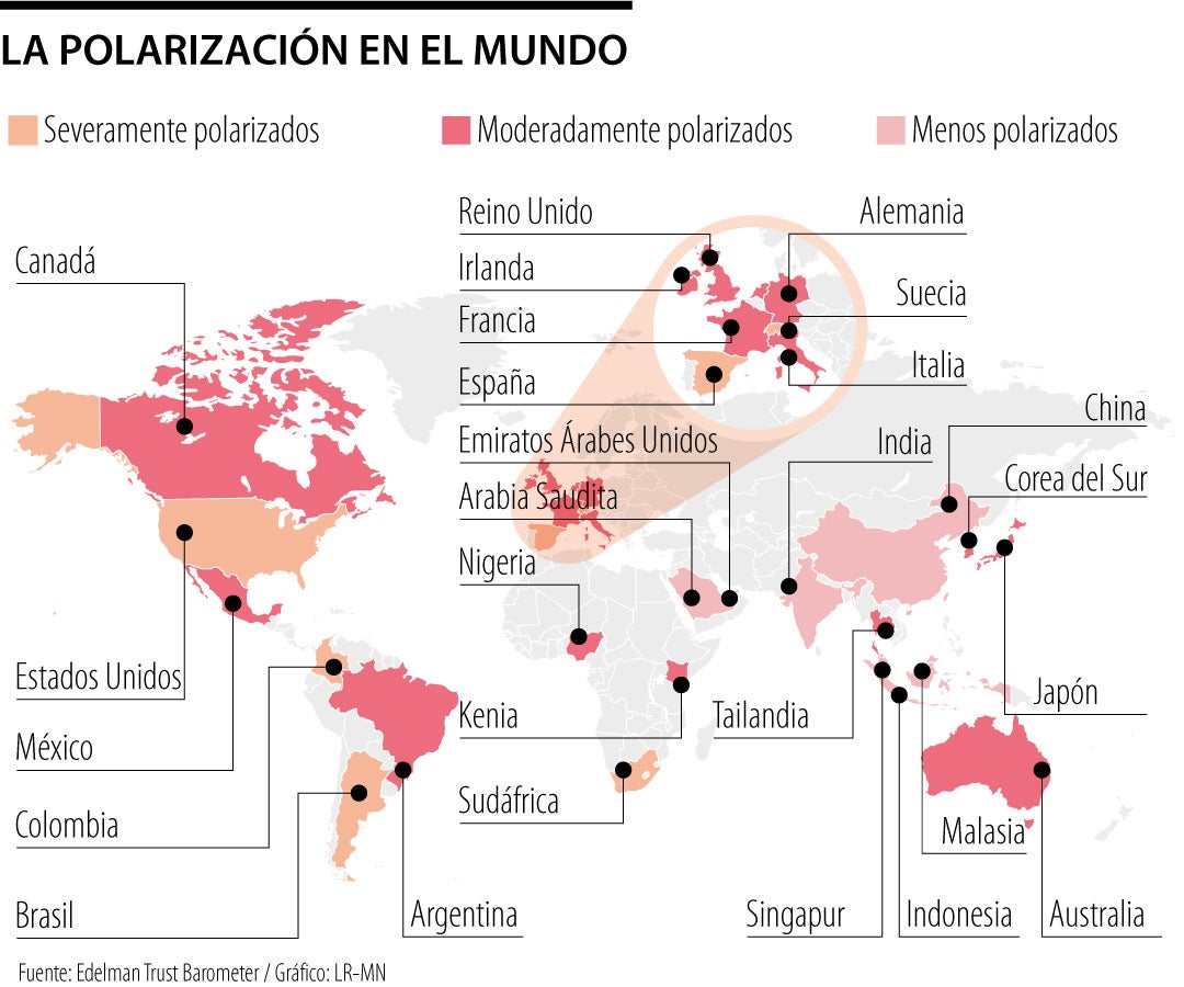 Tras realizar el estudio, Edelman encontró que Argentina, Colombia, Estados Unidos, Sudáfrica, España y Suecia son los países más polarizados del mundo.