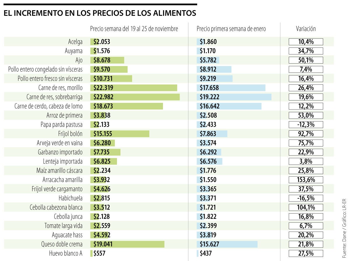 Enero había comenzado con unos precios estables en algunos alimentos, pero con el impacto de la guerra entre Ucrania y Rusia, la volatilidad de la tasa de cambio, así como el fenómeno de La Niña que ha estado presente durante todo el año, se generaron grandes alzas al cierre de noviembre en tubérculos y granos como la arracacha y la cebolla cabezona blanca, las cuales tuvieron un incremento de 153,6% y 104,1% respectivamente.