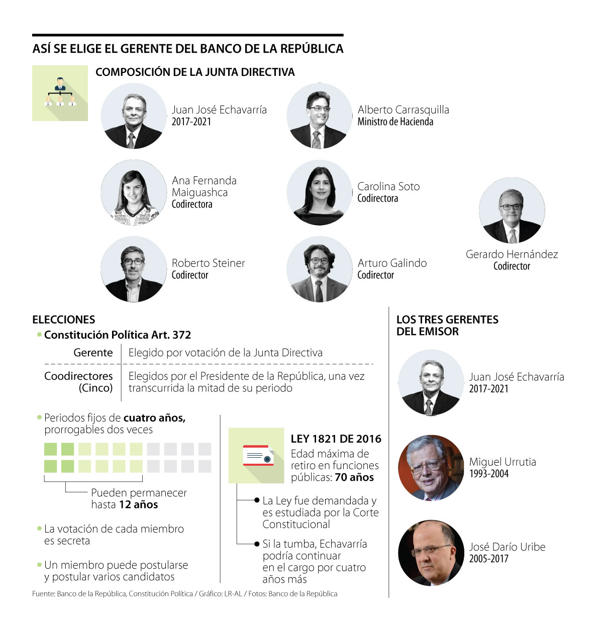 La Junta Directiva es conformada por siete miembros: el gerente, el ministro de Hacienda y cinco codirectores. Si el actual gerente expresa oficialmente a los demás integrantes su pretensión de continuar en el cargo, y estos lo ven viable, el proceso de elección sería más fácil, pues se pondría a consideración de la Junta.