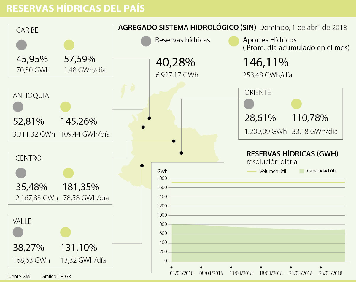 A pesar del inicio de la temporada de lluvias, los embalses mantuvieron sus reservas hídricas estables, pues según XM, su volumen útil se ubicó el domingo en 6.927,17 GWh, lo cual continúa con la tendencia decreciente de los últimos meses, pues en el último mes el promedio se ubicó en 6.820,81 GWh, por debajo del dato de febrero que fue 8.521,23 y de enero de 10.203,93 GWh.