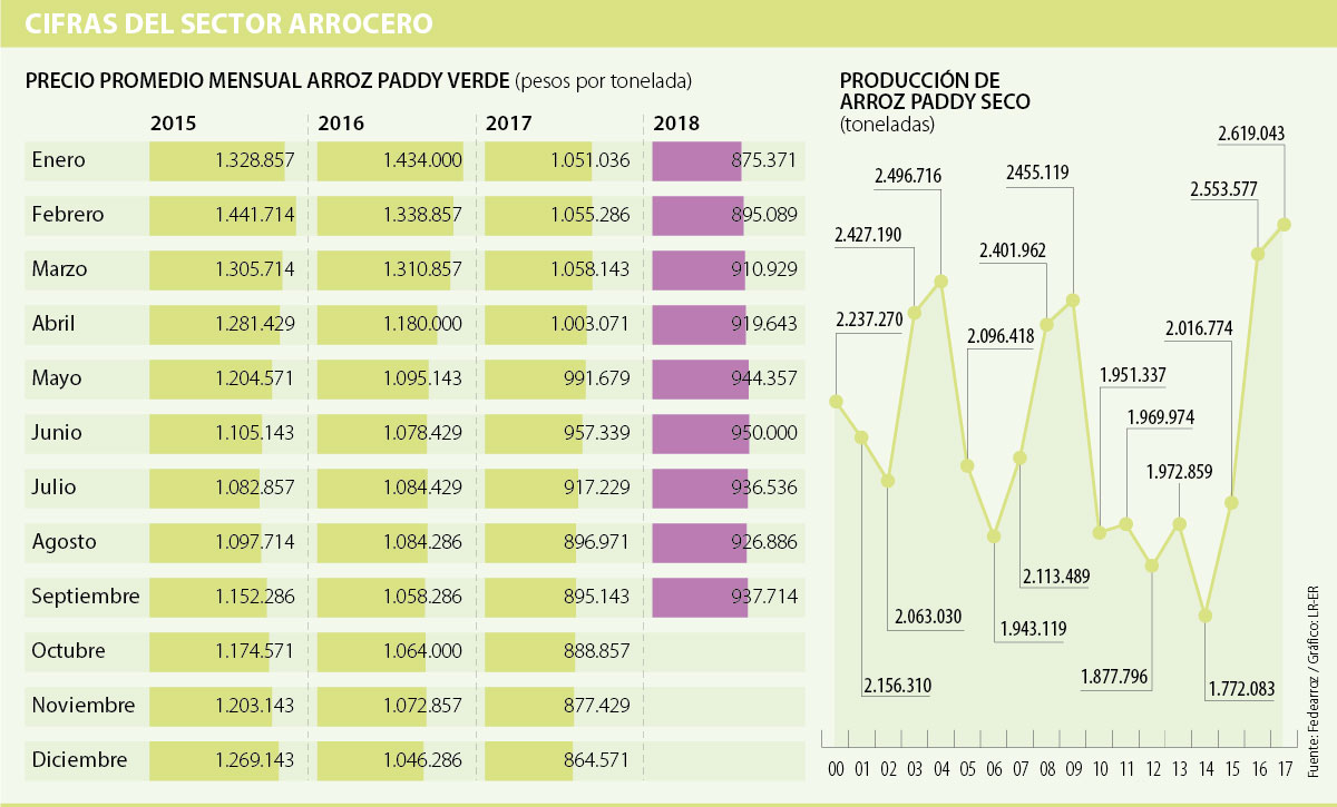 Desde mediados de 2017, los precios del arroz colombiano experimentaron una fuerte caída, que los conocedores del sector han explicado como una consecuencia de una sobreproducción del grano. Si bien el precio promedio mensual del arroz paddy verde de septiembre de este año se ha recuperado 4,76% con respecto al del mismo mes del año pasado, la preocupación en el sector se mantiene, pues los precios no están en su mejor momento y al país llegaría más del cereal proveniente de Ecuador y Perú, lo que pondría más presiones bajistas.