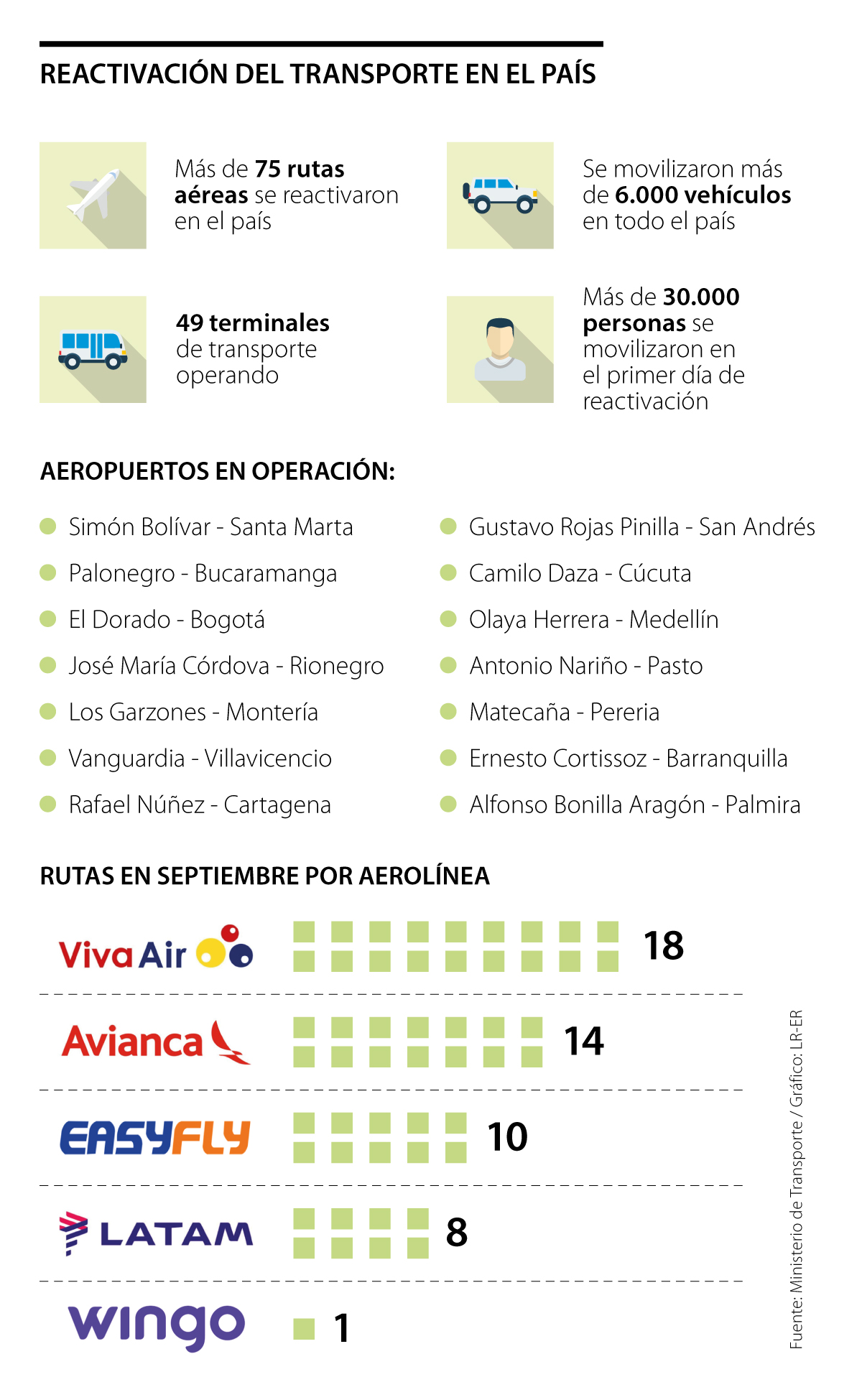 Aunque al cierre de la edición aún no se tenía un dato concreto sobre la movilización de viajeros aéreos, se estima que en el primer día de reactivación se movieron un poco más de 10.000 usuarios en todos los vuelos nacionales. El Aeropuerto El Dorado, por ejemplo, confirmó que se habilitaron 14 rutas hacia el Eje Cafetero, Antioquia, la Costa, el Occidente y los santanderes, muy por encima de lo que se le permitió a los aeropuertos de Rionegro, Medellín, Barranquilla, Cartagena y Bucaramanga.