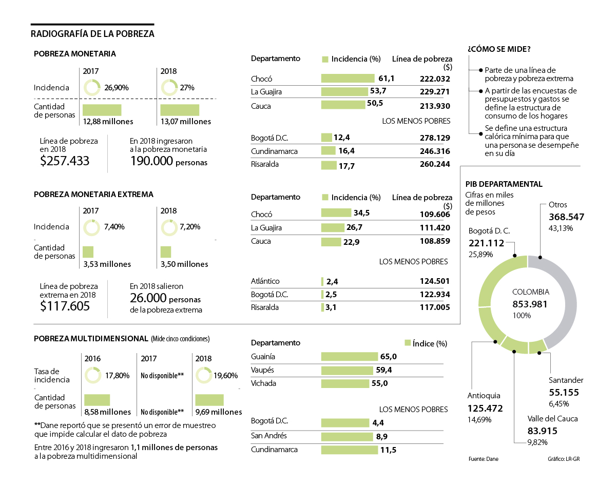 Según las cuentas del Dane, entre 2016 y 2018 ingresaron 1,1 millones de personas a la pobreza multidimensional, aclarando que el dato de 2017 no está disponible por un error en el muestreo. Si se observa este cálculo por departamentos, cifra entregada la semana pasada, Guainía (65,0%), Vaupés (59,4%), Vichada (55,0%), La Guajira (51,4%) y Chocó (45,1%) son las regiones con la mayor población que tienen obstáculos para acceder a las necesidades básicas y elementos de calidad de vida.