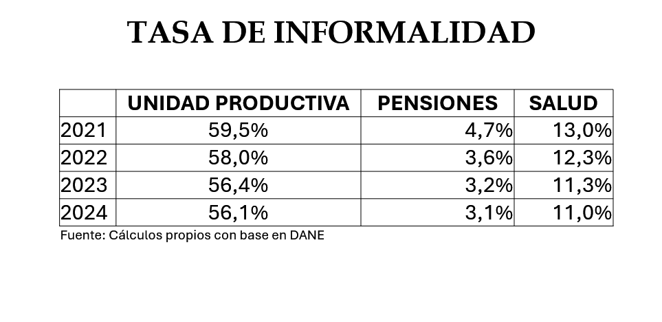 Para Hernández Rodríguez hay que tener mucho detalle con la interpretación que se le da a las estadísticas de informalidad. “A mayo de 2024 tendríamos 56,1% de informalidad visto por unidad productiva, pero si lo vemos como otra forma de medición, que es la que toma el Dane, por ejemplo, en pensiones, la tasa de informalidad sería de 3,1%, y si me voy para salud sería de 11%“, precisó.