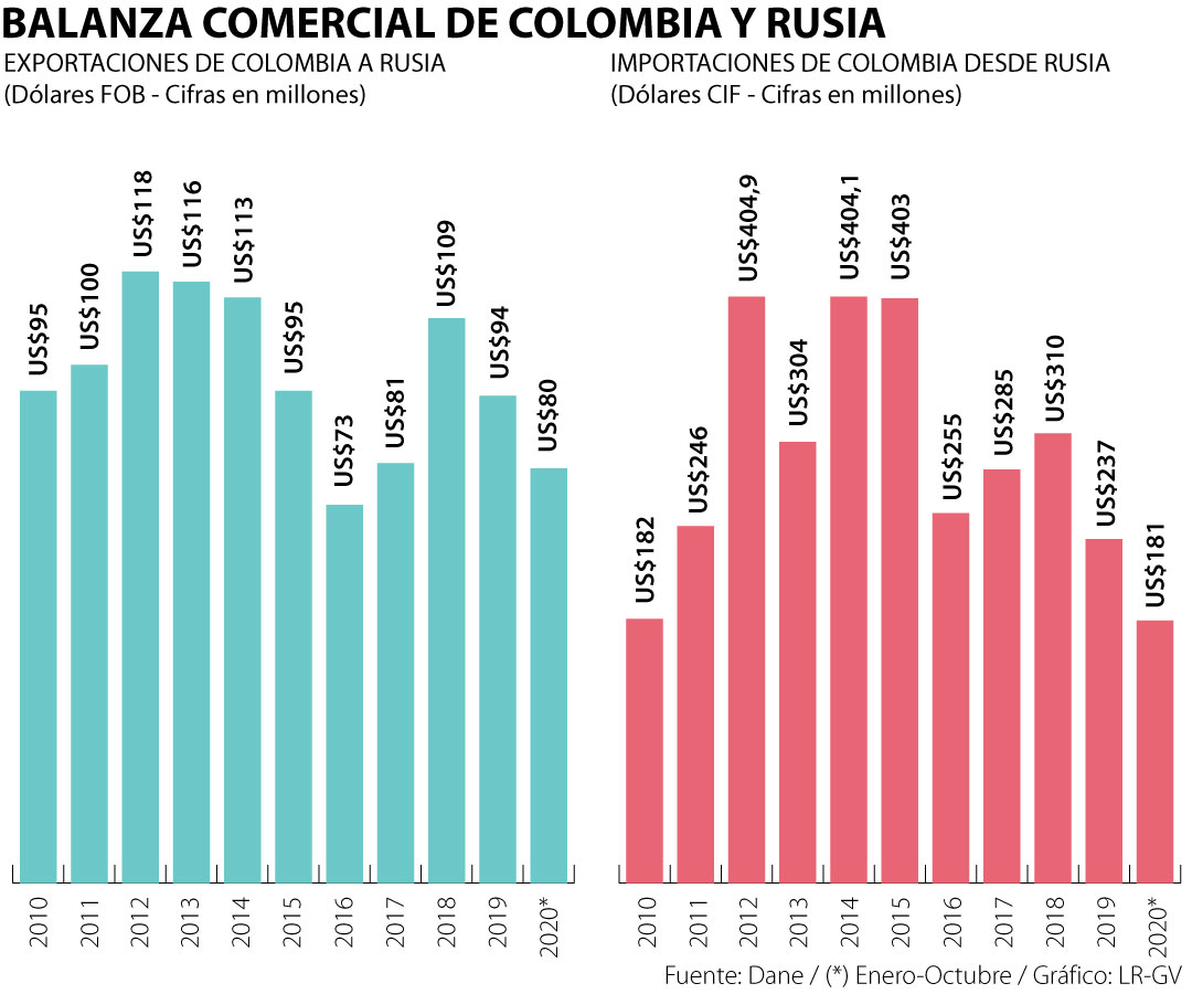 Como 2020 fue un año atítpico por el tema de la pandemia, se revisó el dato de la balanza comercial para 2018, pero los resultados son igual descendentes: las exportaciones de Colombia a Rusia en ese año sumaron US$109,5 millones, mientras que las importaciones totalizaron US$310,6 millones.
