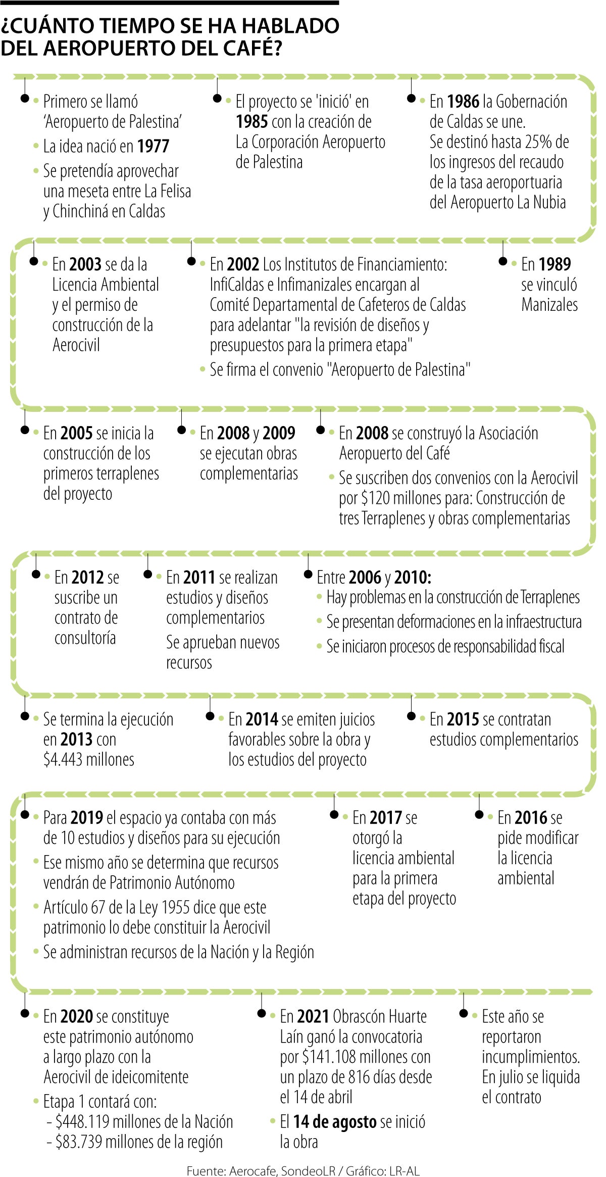 Unos ocho años después el que hoy se conoce como 'Aeropuerto del Café' empezaría a tomar forma con la creación de la Corporación Aeropuerto de Palestina, que tenía como meta promover la construcción del proyecto. En su momento se vincularon: el Municipio de Palestina y la Cámara de Comercio de Manizales; la Gobernación de Caldas y el Municipio de Manizales.