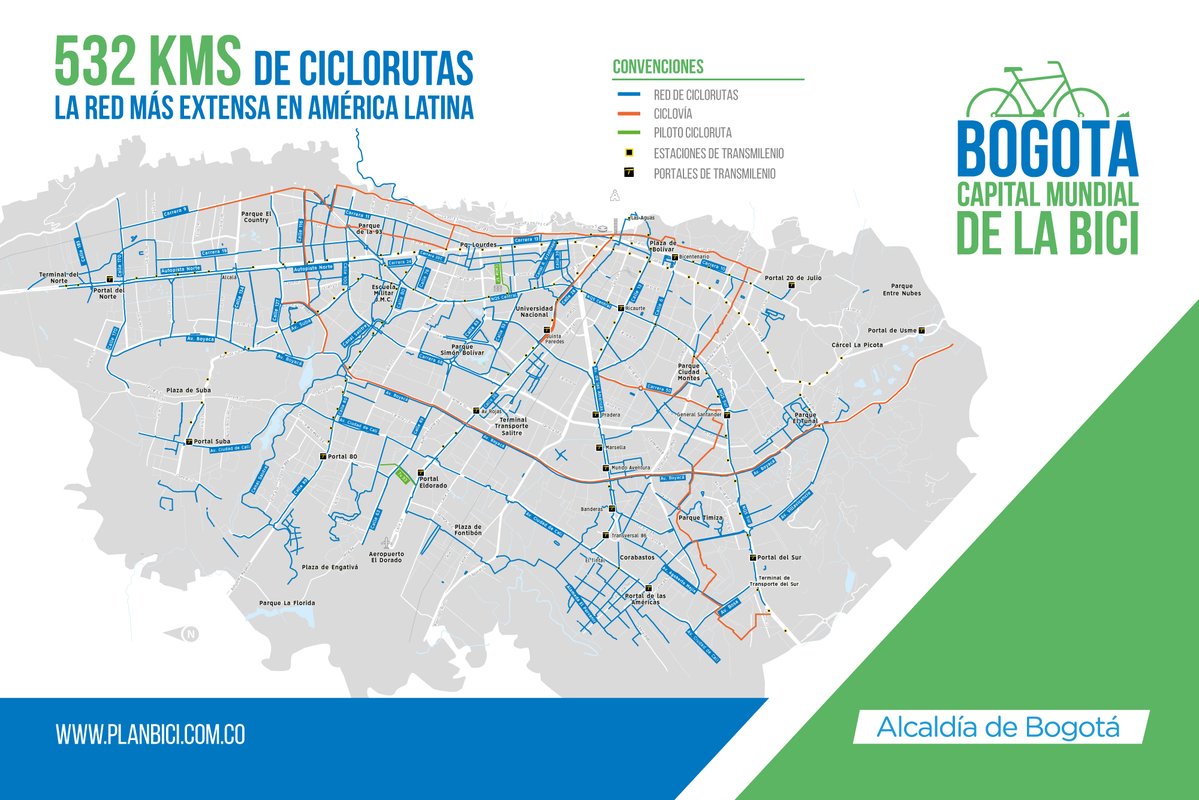 A los 532 kilómetros de ciclorrutas con los que cuenta Bogotá, hoy se le suman 99 kilómetros habilitados para ciclovías, en diez vías que se utilizan para este fin los domingos y festivos. Estas son la Avenida Boyacá, Avenida El Dorado, Carrera Séptima, Carrera Novena, Carrera 15, Carrera 50, Calle 72, Calle 22 sur, Calle 39 sur y Pepe Sierra.