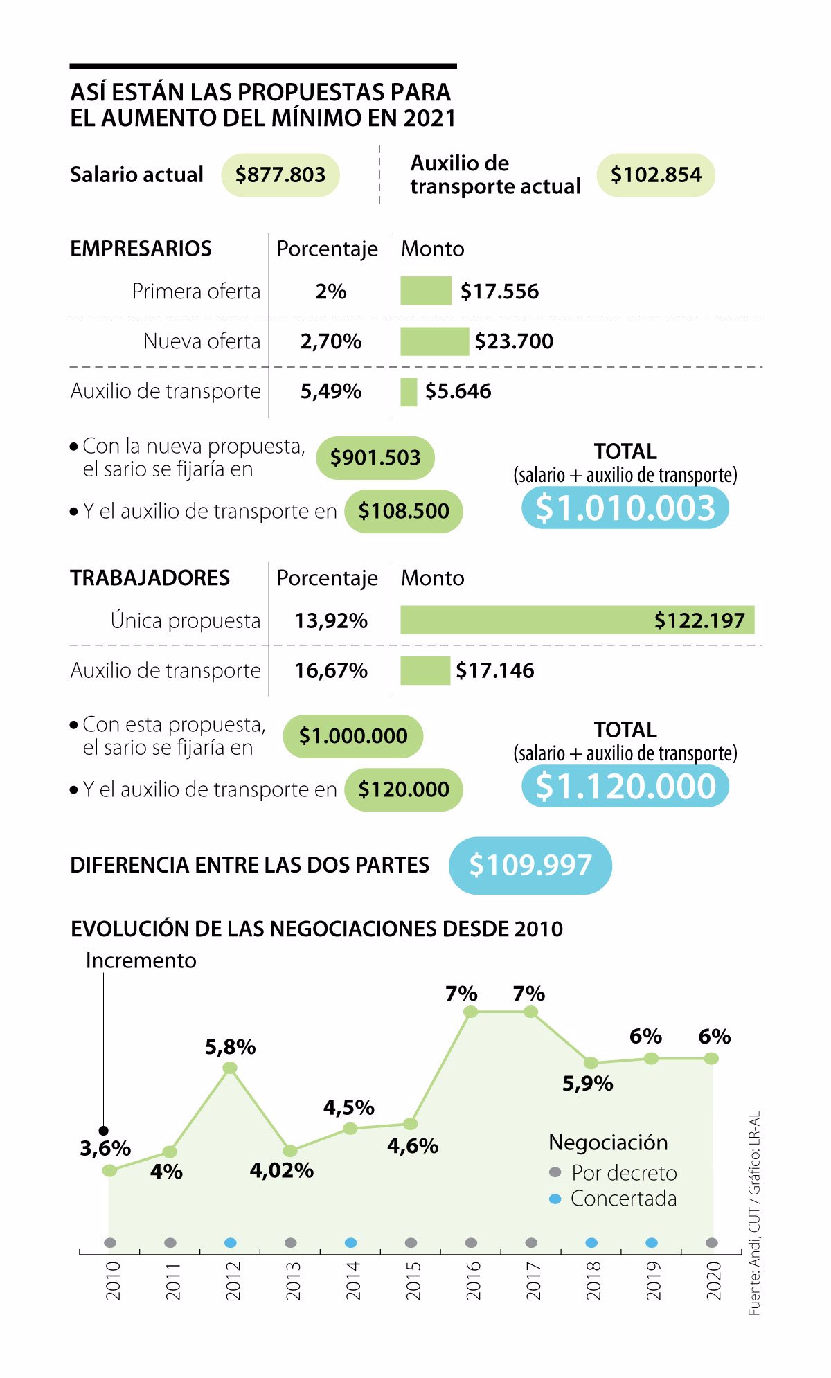 Con estas propuestas, y aunque el Gobierno Nacional, ya ha dicho que la meta de la gestión del presidente Duque es tener un salario mínimo de un millón, la decisión buscar estar entre el $1.120.000 que buscan los sindicatos de los trabajadores y el $1.010.003 que ofrecen los empleadores. A ambos los separa una cifra de $109.997.