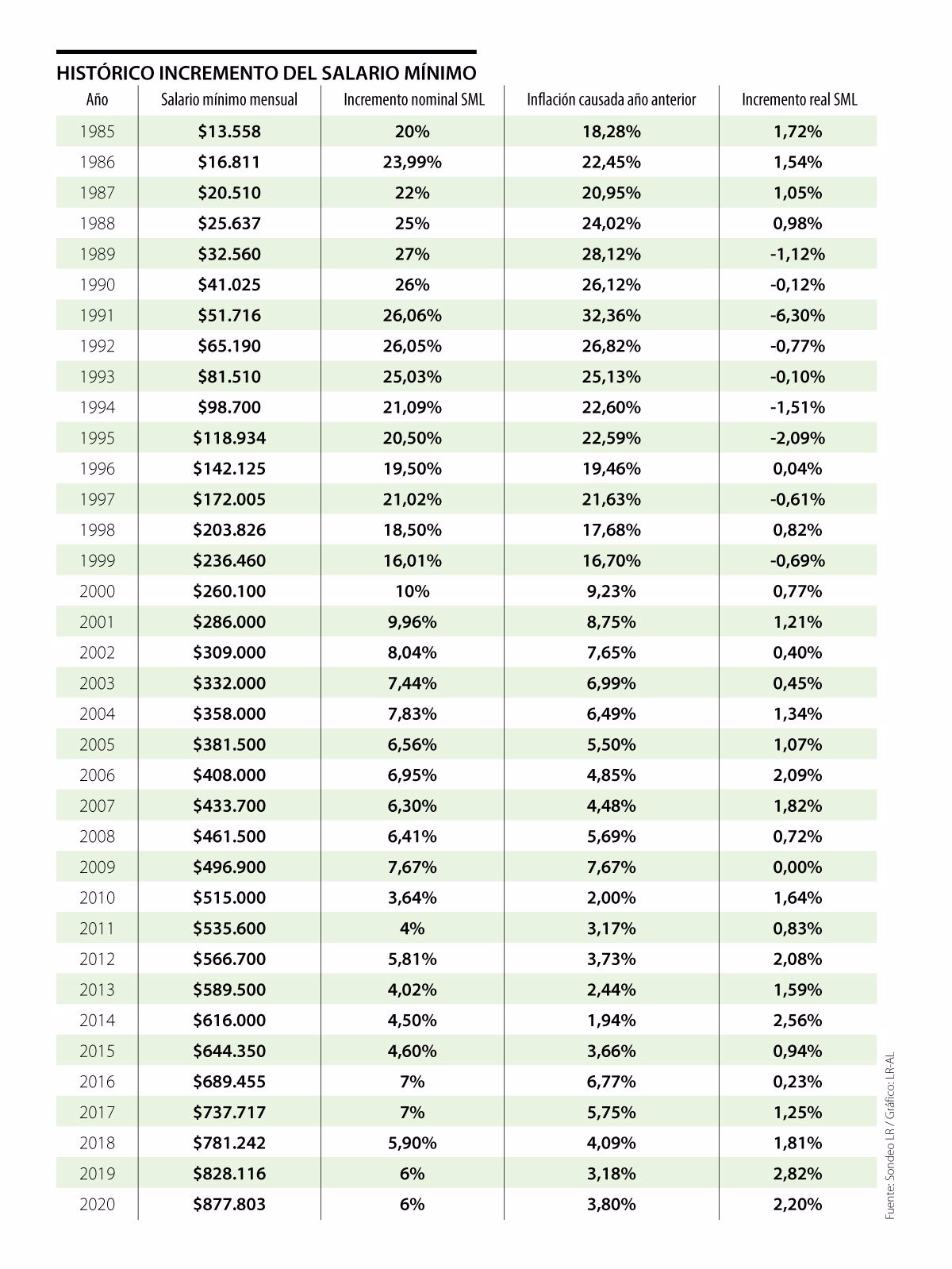 El pasado 21 de diciembre este medio adelantó que el Gobierno analizaba un aumento del mínimo de 3,5%. Con este incremento, que serían unos $30.723, el mínimo pasaría de $877.803 a $908.526. En cuanto al auxilio de transporte, la posibilidad que se estudiaba era un alza de 6%, pasando de de $102.854 a $109.025.
