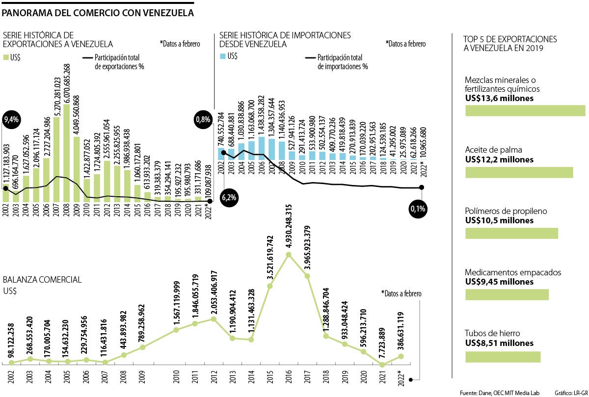 De acuerdo con cifras del Dane, con corte a febrero, las exportaciones a Venezuela fueron por US$109,1 millones. Para el caso de las importaciones el dato fue de US$10,9 millones, con una participación de 0,1% del total registrado para ese lapso por el Departamento Estadístico. Esto refleja una realidad que se ha vivido históricamente y que la balanza entre ambos países ha sido superavitaria para Colombia.