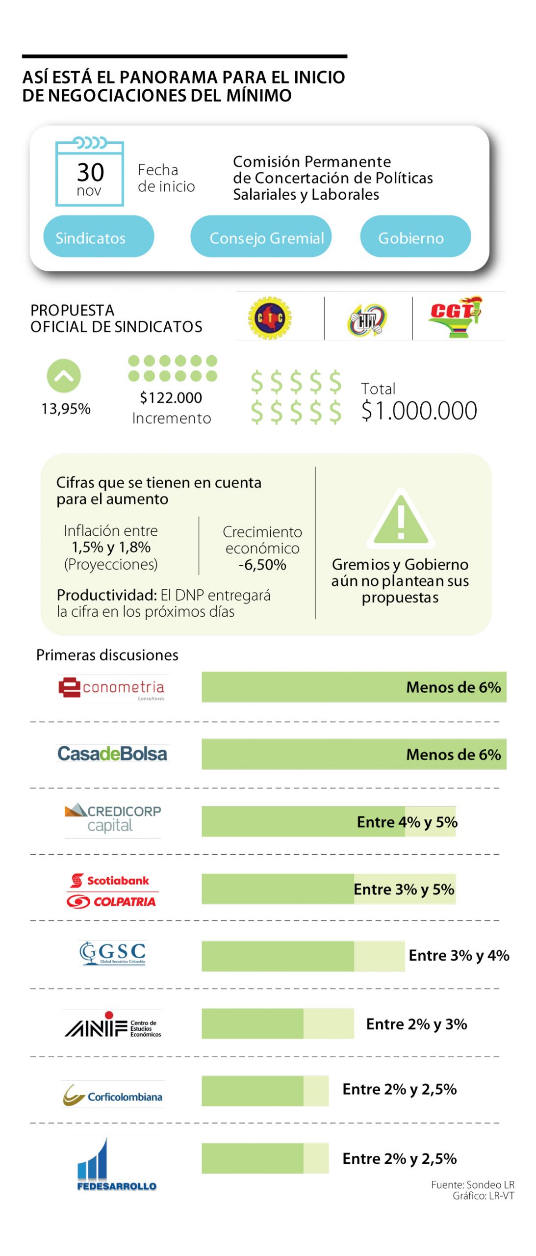 Hasta el momento, los únicos que han emitido una propuesta oficial para la mesa tripartita son los trabajadores, con una expectativa de 13,9% ($123.000) para que el mínimo sea de $1 millón, sin tener en cuenta el auxilio de transporte, que pasaría de $102.854 a $117.150.