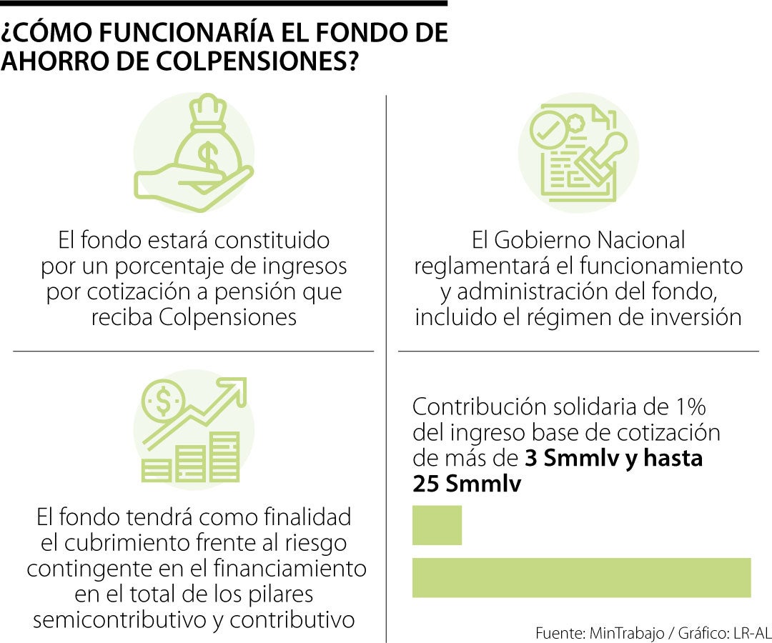 Según se establece en el borrador, este Fondo estaría constituido por un porcentaje de los ingresos por cotización a pensión que reciba el Componente de Prima Media del Pilar Contributivo. Los recursos adicionales, a partir de la entrada en vigencia de esta ley, estarían establecidos con 20% del total del ingreso de las cotizaciones para el periodo entre 2025 y 2030. El procentaje iría aumentando progresivamente hasta llegar a 50% entre 2052 y 2072. El Gobierno Nacional sería el que reglamentaría el funcionamiento y administración de ese Fondo.