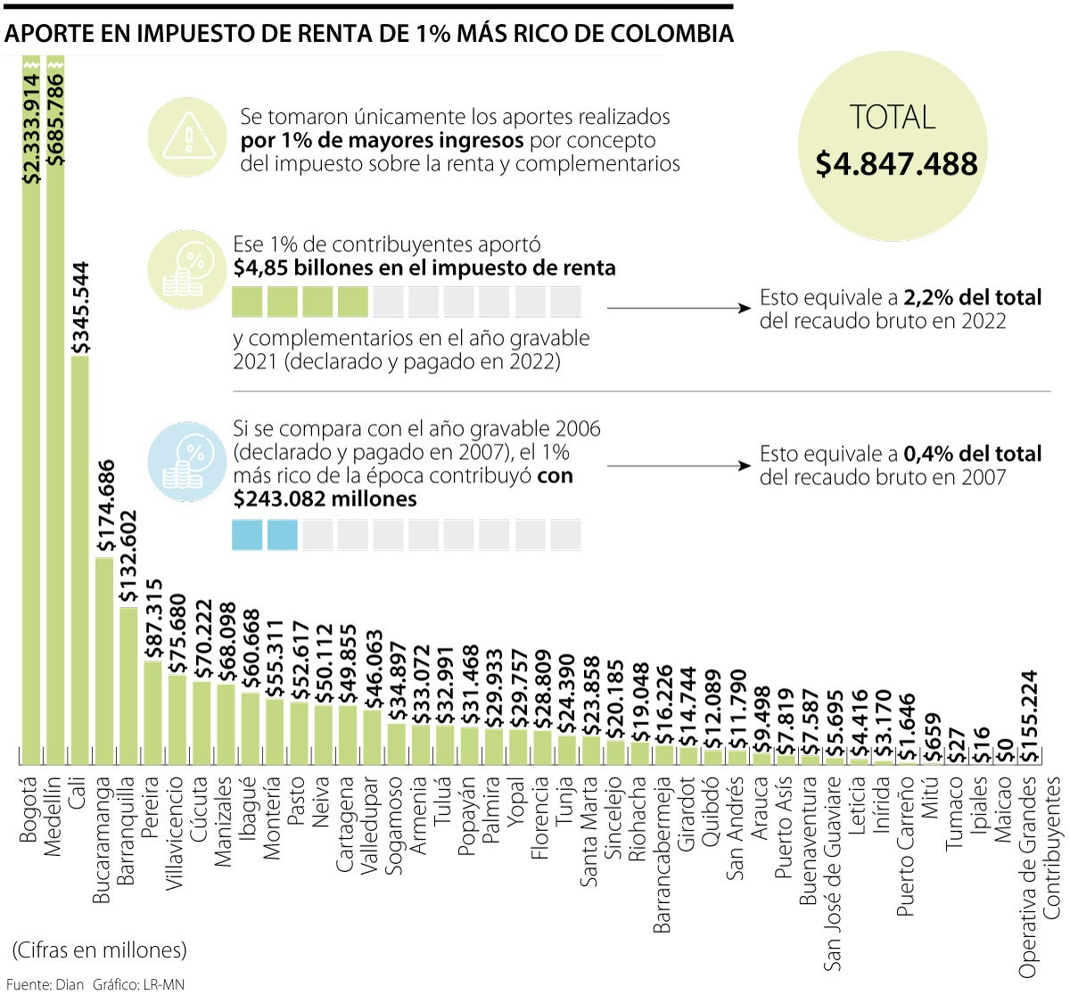 Según cifras que entregó la Dian, el 1% más rico del país, tomando como fuente el total de ingresos brutos incluidos en las declaraciones del impuesto a la renta y complementarios de las personas naturales, aportó $4,85 billones en ese mismo impuesto en 2022 (para el año gravable 2021), de los más de $228,3 billones de recaudo bruto total.