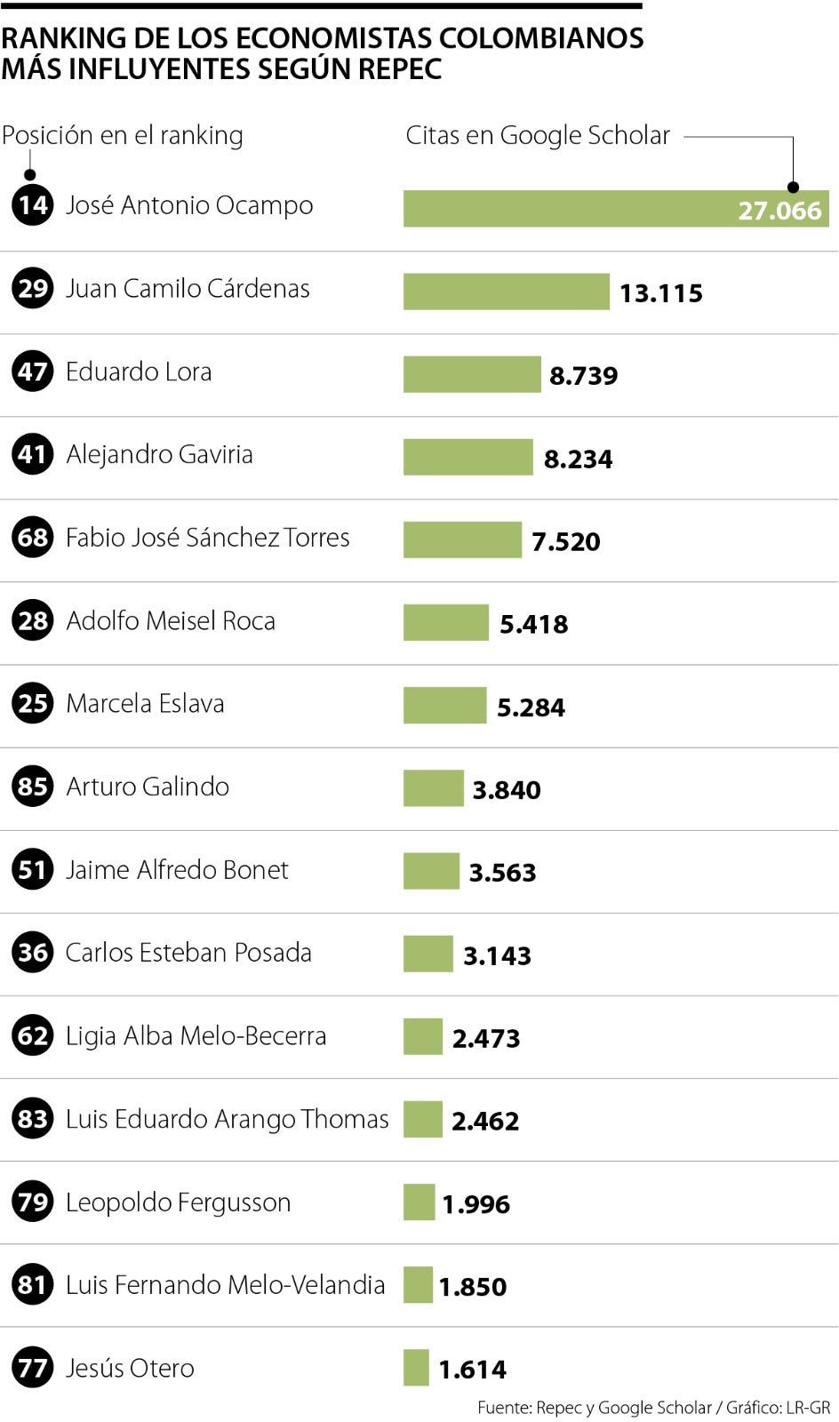 El ranking Repec es un índice que clasifica a los investigadores en asuntos económicos, y también a instituciones. Lo elabora con base en su presencia en bases de datos académicas. Hay varios expertos colombianos en el gran listado, como es habitual, José Antonio Ocampo se ubica en el primer lugar en cuanto a los economistas colombianos con mayor influencia.