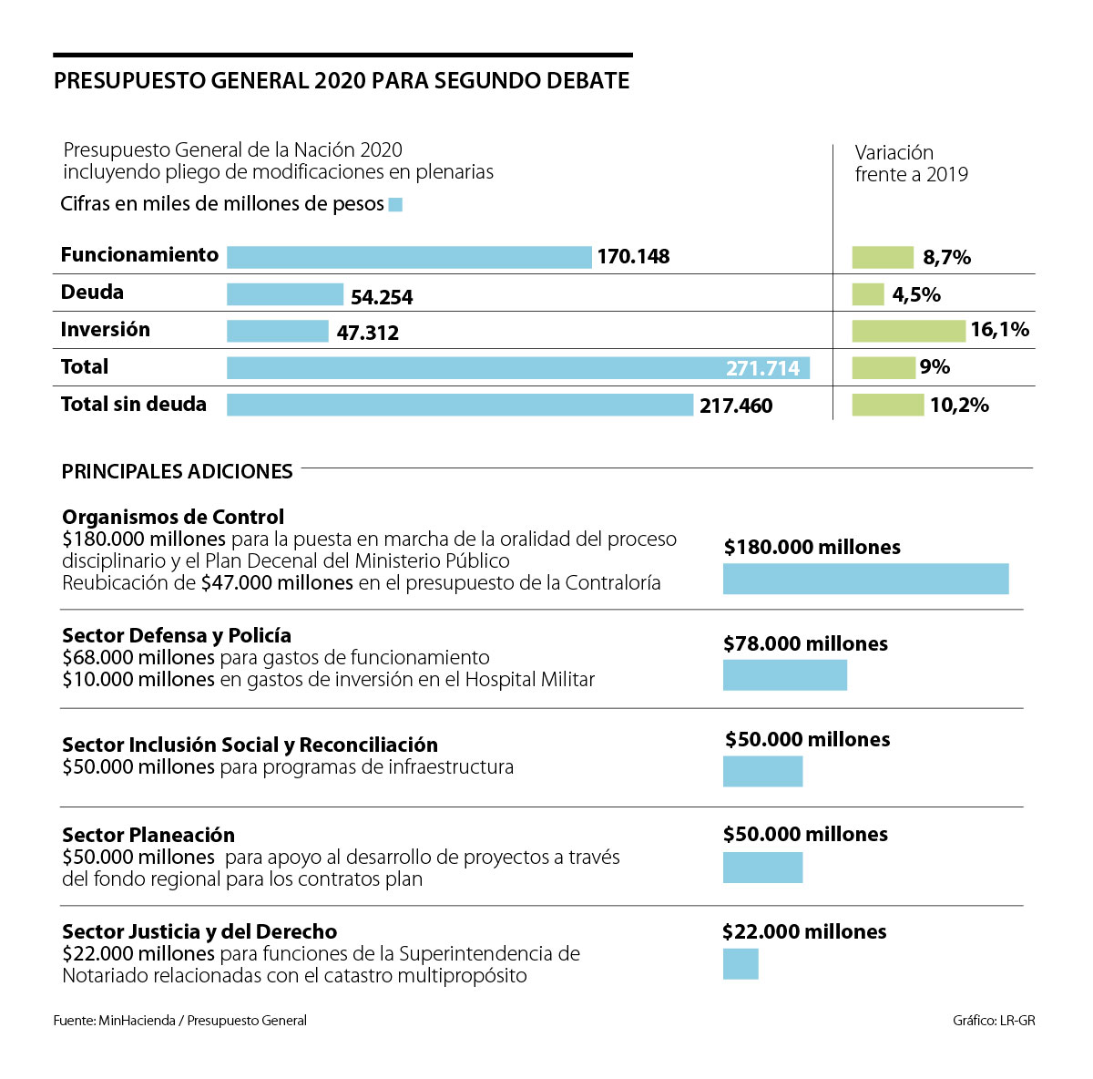 En el sector de Defensa y la Policía se adicionaron $78.000 millones, de los cuales $68.000 millones correponden a gastos de funcionamiento, mientras que otra de las adiciones presupuestales que se acordaron para el segundo debate fueron $50.000 millones para programas de infraestructura en diferentes regiones del país, como parte del presupuesto del sector de Inclusión Social y Reconciliación. Para Planeación, el aumento es de $50.000 millones, que estarán destinados a apoyar el desarrollo de proyectos a través del Fondo Regional.