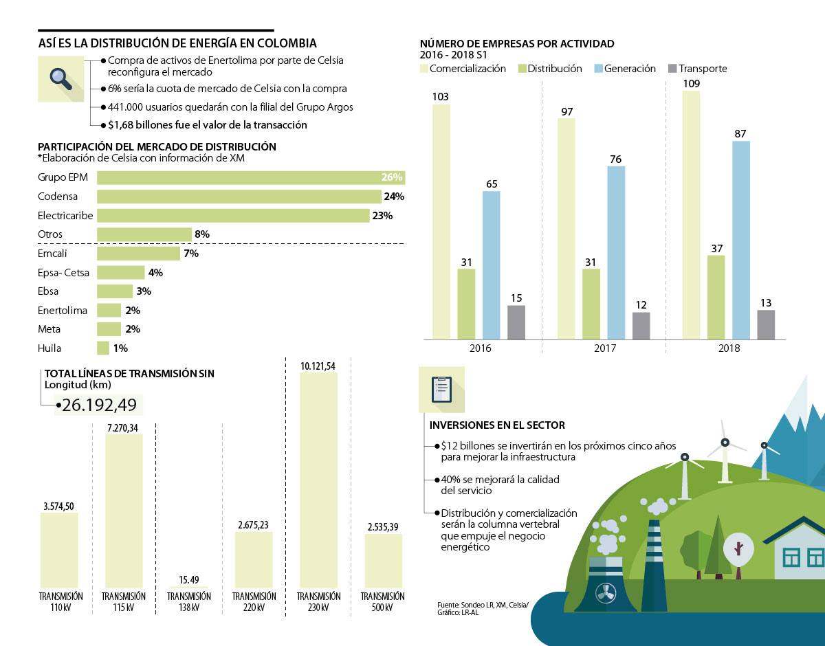 El anuncio del viernes pasado sobre la compra por $1,68 billones de algunos activos de Enertolima por parte de Celsia es, sin duda, una de las movidas empresariales que reacomoda el negocio de distribución de energía. Aunque hoy hay agentes que lideran ampliamente este mercado, la consolidación de Celsia no solo ajusta la comercialización en Tolima y el Valle, sino también abre la puerta para analizar el potencial que tiene este segmento.