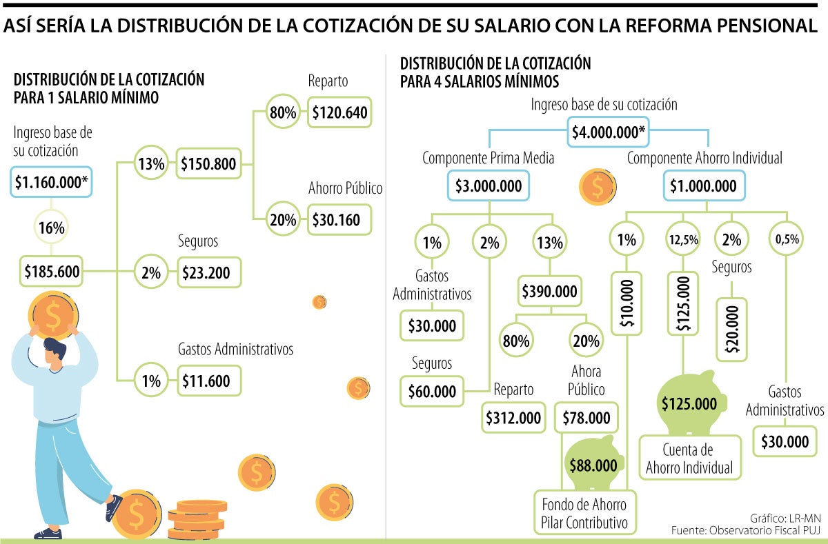 Haciendo un ejemplo con el caso de una persona que gane un salario mínimo, el IBC es de $1,16 millones, entonces la cotización a pensión equivale a $185.600, de los cuales 150.800 irían al ahorro. De ese total, 80% va al reparto ($120.640) y 20% al ahorro público. Unos $23.200 irían a los seguros previsionales y $11.600 a gastos de administración en el componente de Prima Media, es decir, Colpensiones.