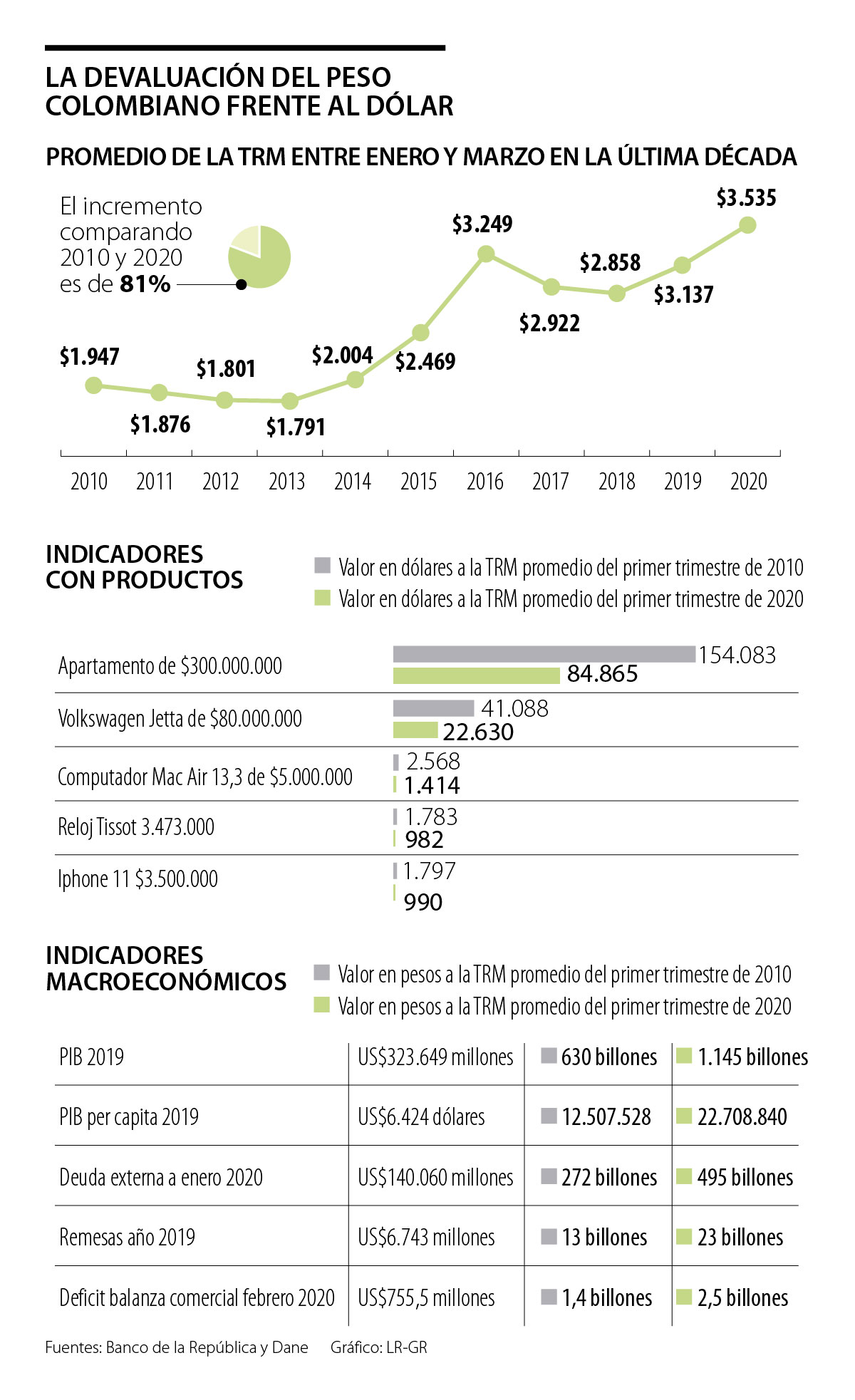Para ponerlo en contexto, lo que hay que pagar hoy para comprar el mencionado producto, a la TRM del primer trimestre de 2020 equivalía a US$1.414, mientras que a la TRM promedio de ese mismo lapso en 2010, equivalía a US$2.568.